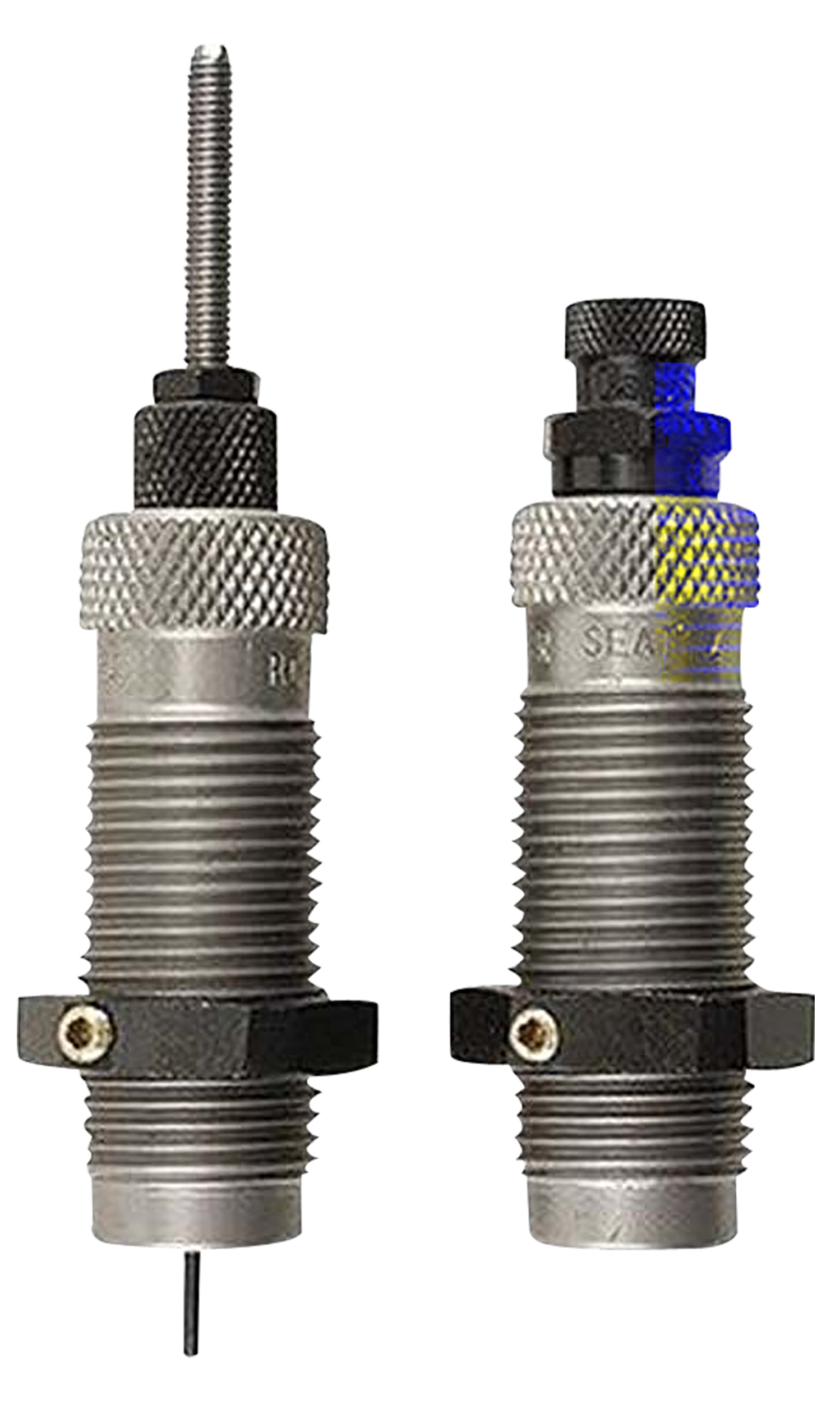 This two-die set is intended for reloading bottleneck cases, and consists of a full-length sizer die with an expander-decapping unit, and a seater die with bullet seater plug.The full-length sizer die brings the case to saami minimum cartridge dimensions.It sizes the outside of the case, de-primes and expands the neck to accept the bullet.The die has vents to prevent case damage caused by trapped air and for excessive lubricant.Headspace is held to minimum tolerances to avoid changing the case body length during full length sizing.The included seater die has a built-in roll crimper to secure the bullet at the same time as it's seated.