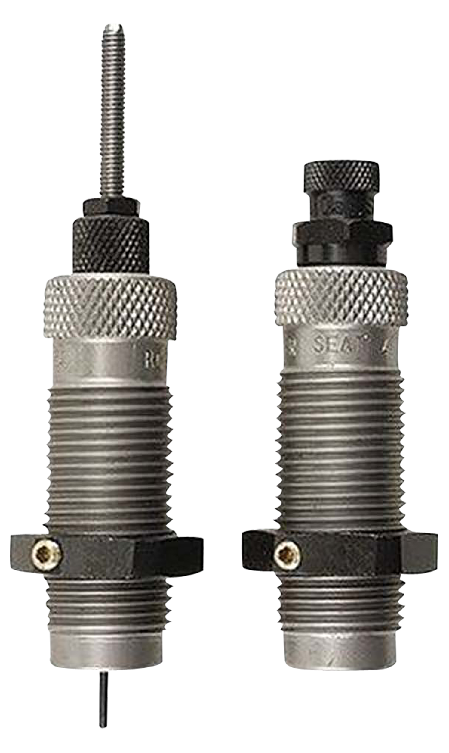 This two-die set is intended for reloading bottleneck cases, and consists of a full-length sizer die with an expander-decapping unit, and a seater die with bullet seater plug.The full-length sizer die brings the case to saami minimum cartridge dimensions.It sizes the outside of the case, de-primes and expands the neck to accept the bullet.The die has vents to prevent case damage caused by trapped air and for excessive lubricant.Headspace is held to minimum tolerances to avoid changing the case body length during full length sizing.The included seater die has a built-in roll crimper to secure the bullet at the same time as it's seated.