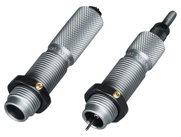 This two-die set is intended for reloading bottleneck cases, and consists of a full-length sizer die with an expander-decapping unit, and a seater die with bullet seater plug.The full-length sizer die brings the case to saami minimum cartridge dimensions.It sizes the outside of the case, de-primes and expands the neck to accept the bullet.The die has vents to prevent case damage caused by trapped air and for excessive lubricant.Headspace is held to minimum tolerances to avoid changing the case body length during full length sizing.The included seater die has a built-in roll crimper to secure the bullet at the same time as it's seated.