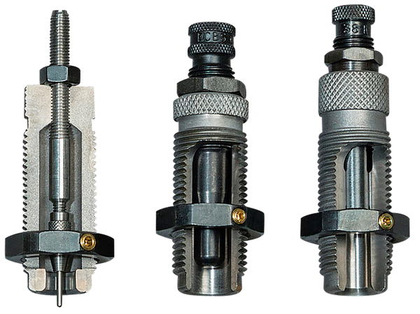 The 3-die roll crimp set is for loading straight-wall cartridges.Its steel sizer die sizes the case and de-primes.The expander die expands the case to the proper diameter to accept the bullet, and it imparts case mouth flare/bell for bullet feeding.The seater die seats the bullet and roll crimps.Note: cases must be lubricated.