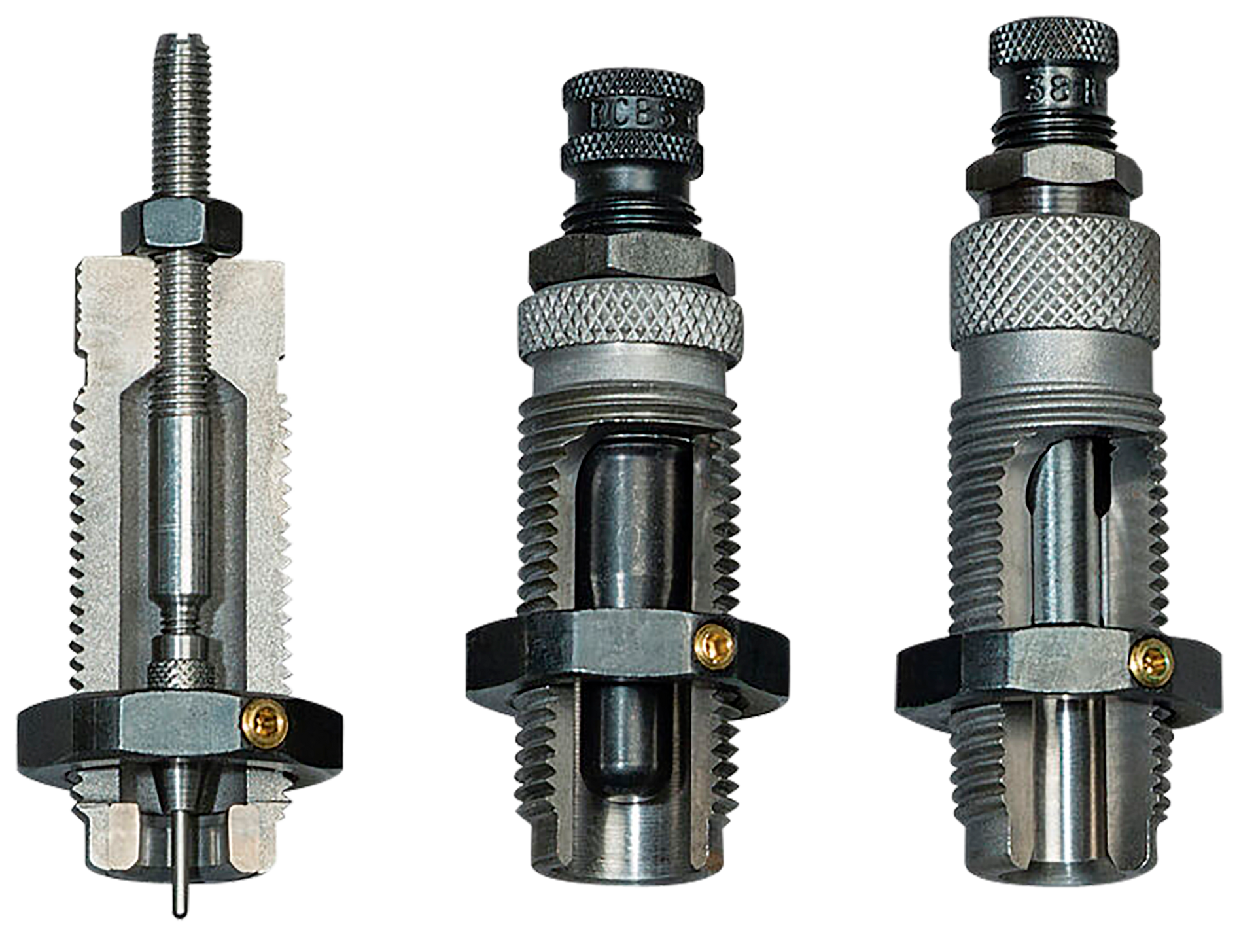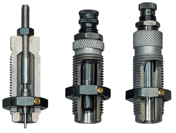The 3-die roll crimp set is for loading straight-wall cartridges.Its steel sizer die sizes the case and de-primes.Note: cases must be lubricated.The expander die expands the case to the proper diameter to accept the bullet, and it imparts case mouth flare/bell for bullet feeding.The seater die seats the bullet and roll crimps.