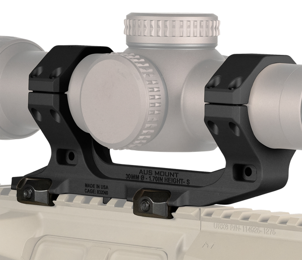 Introducing the 1.70 inch bore height aus mount for 30mm diameter magnified optics, from reptilia.Driven by the request of an end user group, the aus mount is the culmination of a 2 year development program.Like the dot mount line the aus mount attaches to any m1913 picatinny rail via our anti-snag spring-loaded nitride steel clamp and custom bolt mounting system which can be tightened with a t-25 torx or a flat blade driver to sit flush with the body of the mount for a low-profile, streamline design.Also like our dot mount line, the aus mount is machined from a single piece of billet 7075-t6 aluminum and is finished with mil-std type iii, class 2, hard anodize coating.