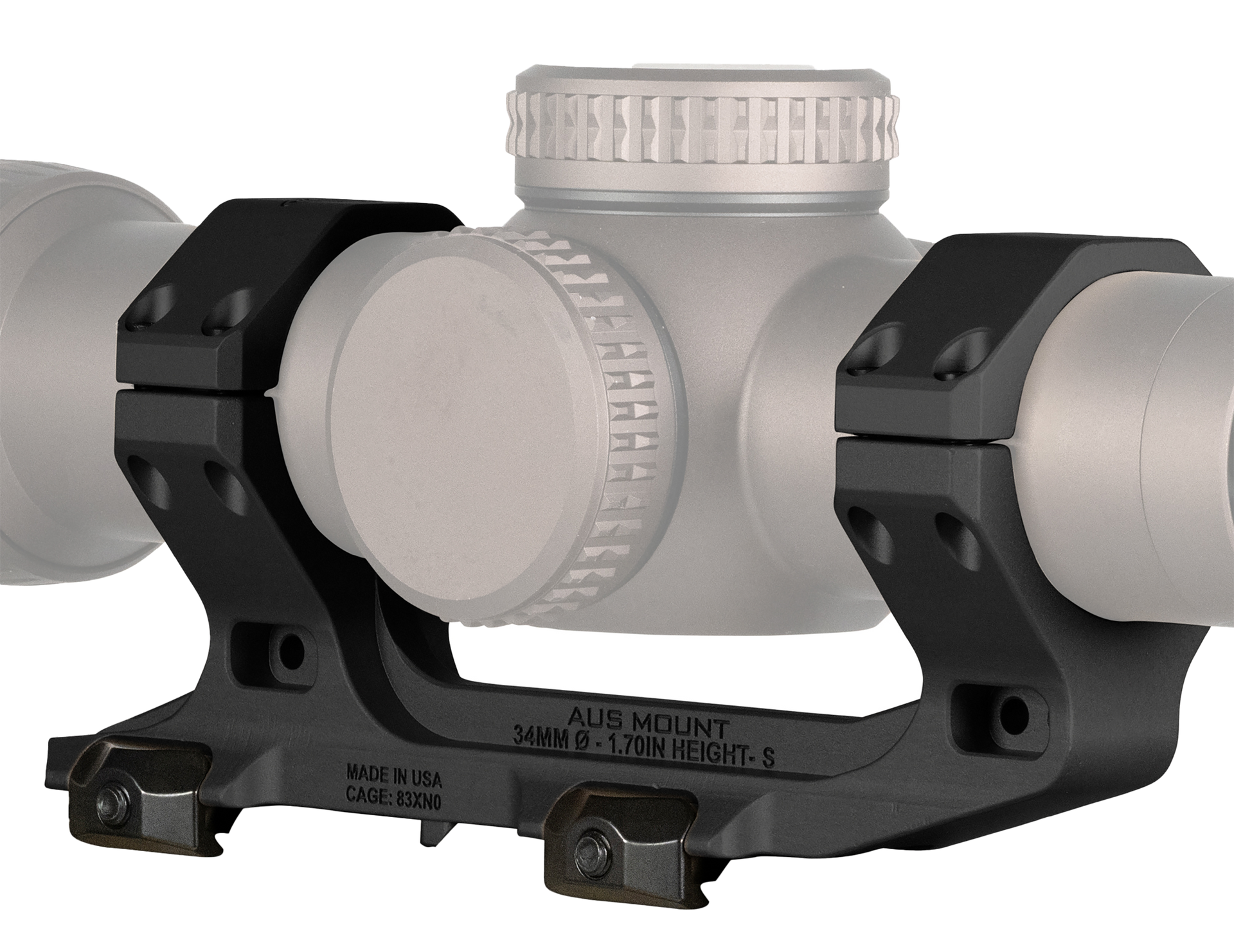 Introducing the 1.70 inch bore height aus mount for 34mm diameter magnified optics, from reptilia.Driven by the request of an end user group, the aus mount is the culmination of a 2 year development program.Like the dot mount line the aus mount attaches to any m1913 picatinny rail via our anti-snag spring-loaded nitride steel clamp and custom bolt mounting system which can be tightened with a t-25 torx or a flat blade driver to sit flush with the body of the mount for a low-profile, streamline design.Also like our dot mount line, the aus mount is machined from a single piece of billet 7075-t6 aluminum and is finished with mil-std type iii, class 2, hard anodize coating.