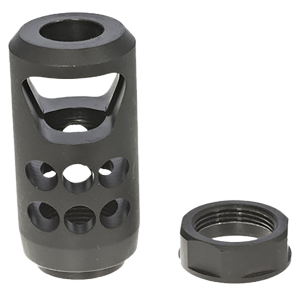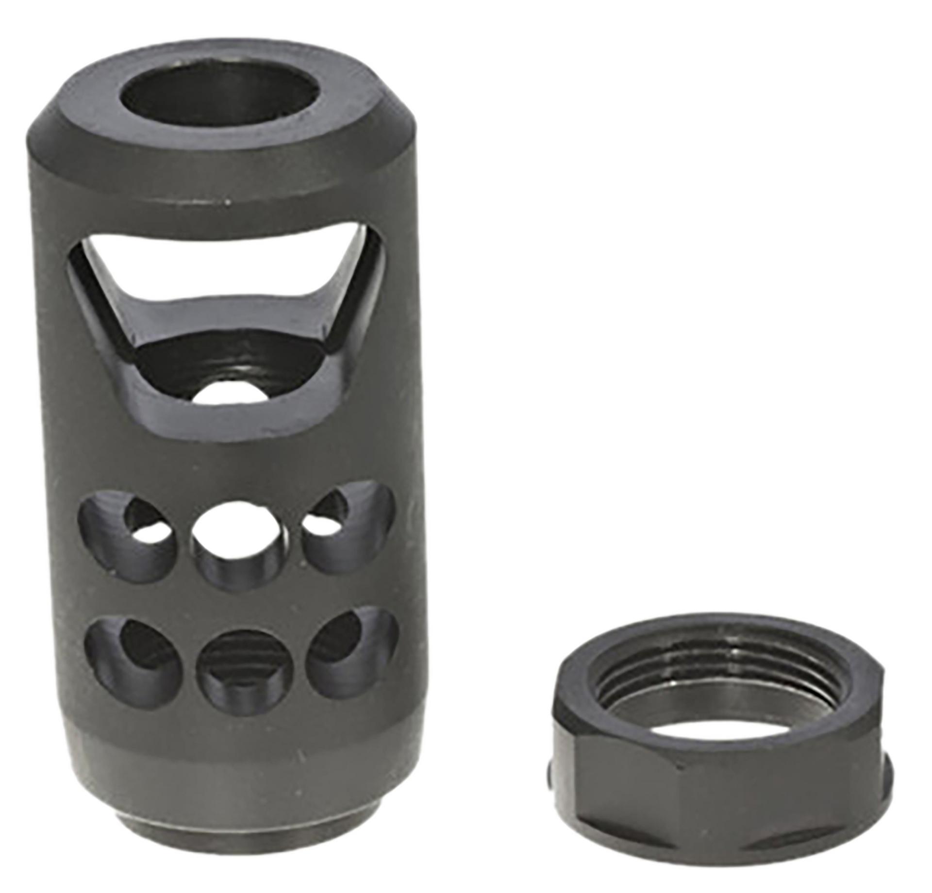 Made in the usa, the ruger american ranch rifle muzzle brake helps reduced recoil contributes to improved accuracy over a longer string of fire.The brake clocks into position using an easy-to-use external jam nut.It reduces noise and blast to the sides of the shooter.Installs quickly using an 7/8" box wrench or crescent wrench.The brake is manufactured from alloy steel with a matte black finish.