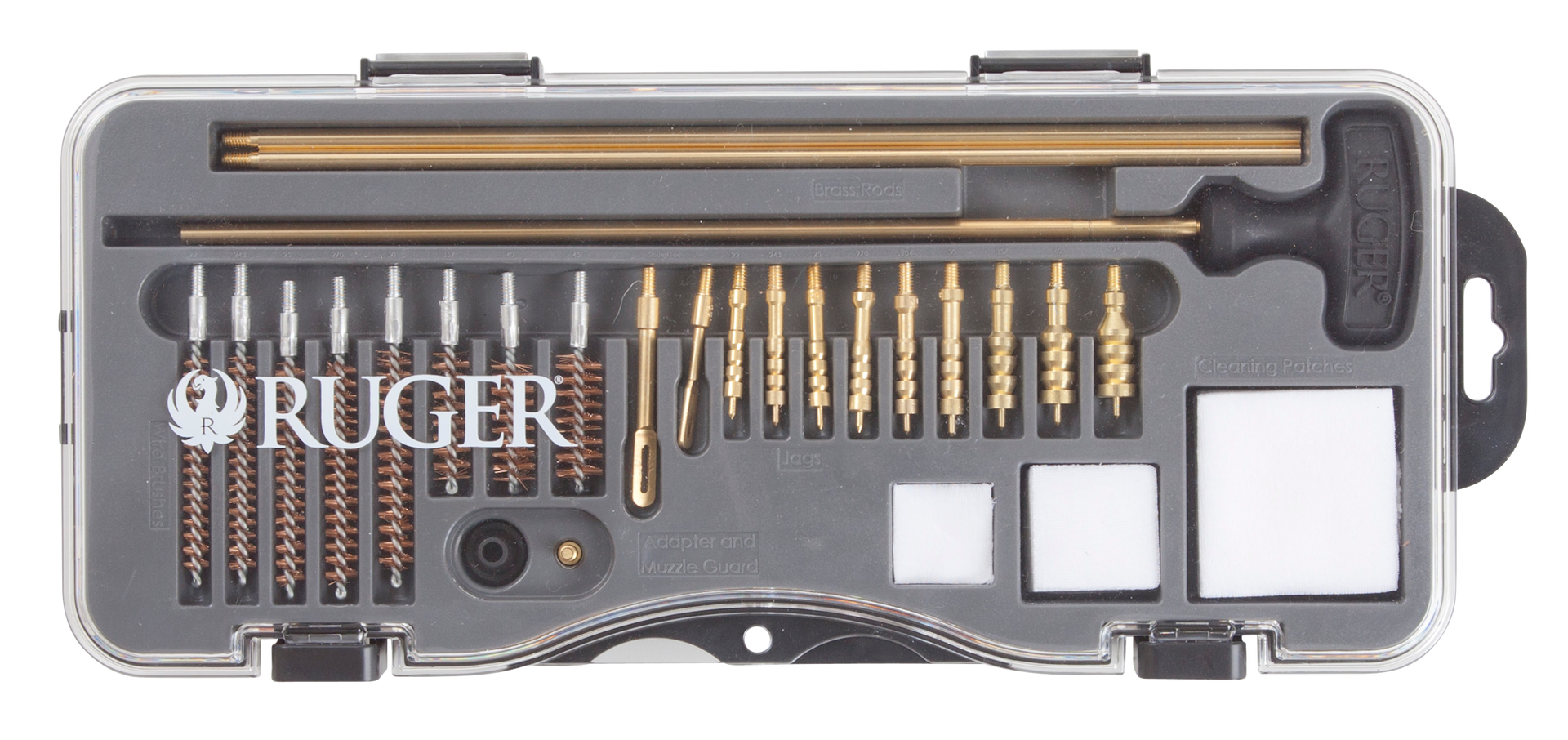 <p>the ruger rifle/handgun cleaning kit is packed in a molded toolbox and includes cleaning jags for.45,.40,.357/9mm,.30,.284/7mm,.270,.25,.243, and.22 caliber; bronze bore brushes for.45,.40,.357/9mm,.30,.270,.25,.243, and.22 caliber; heavy-duty brass cleaning rod; brass slotted tips for.22 and.30 caliber; brass adapter; 2" , 1.25", and.875" cotton cleaning patches; and a muzzle guard.</p>