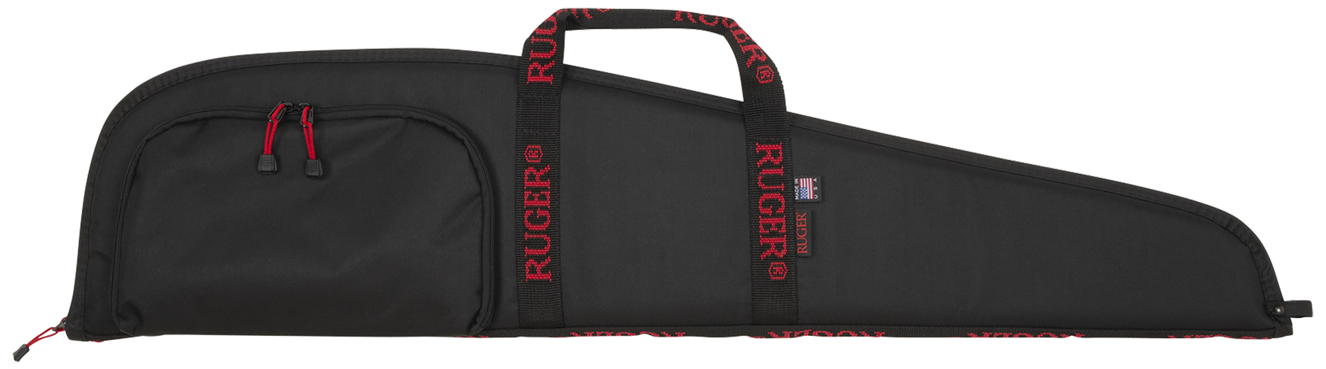 Ruger rifle case, by allen, is a classic black with the ruger name on the carry handles and a zippered accessory pocket to hold magazines and other accessories.The dense foam padding will keep your rifle secure and safe during transportation.Made in the usa.Type: Rifle CaseColor: Black/RedDimensions: 10" x 42" x 2"Material: EnduraFinish: TexturedHardware: Full Length ZipperPadding: FoamCrushproof: NoGuns Held: RifleView more