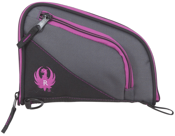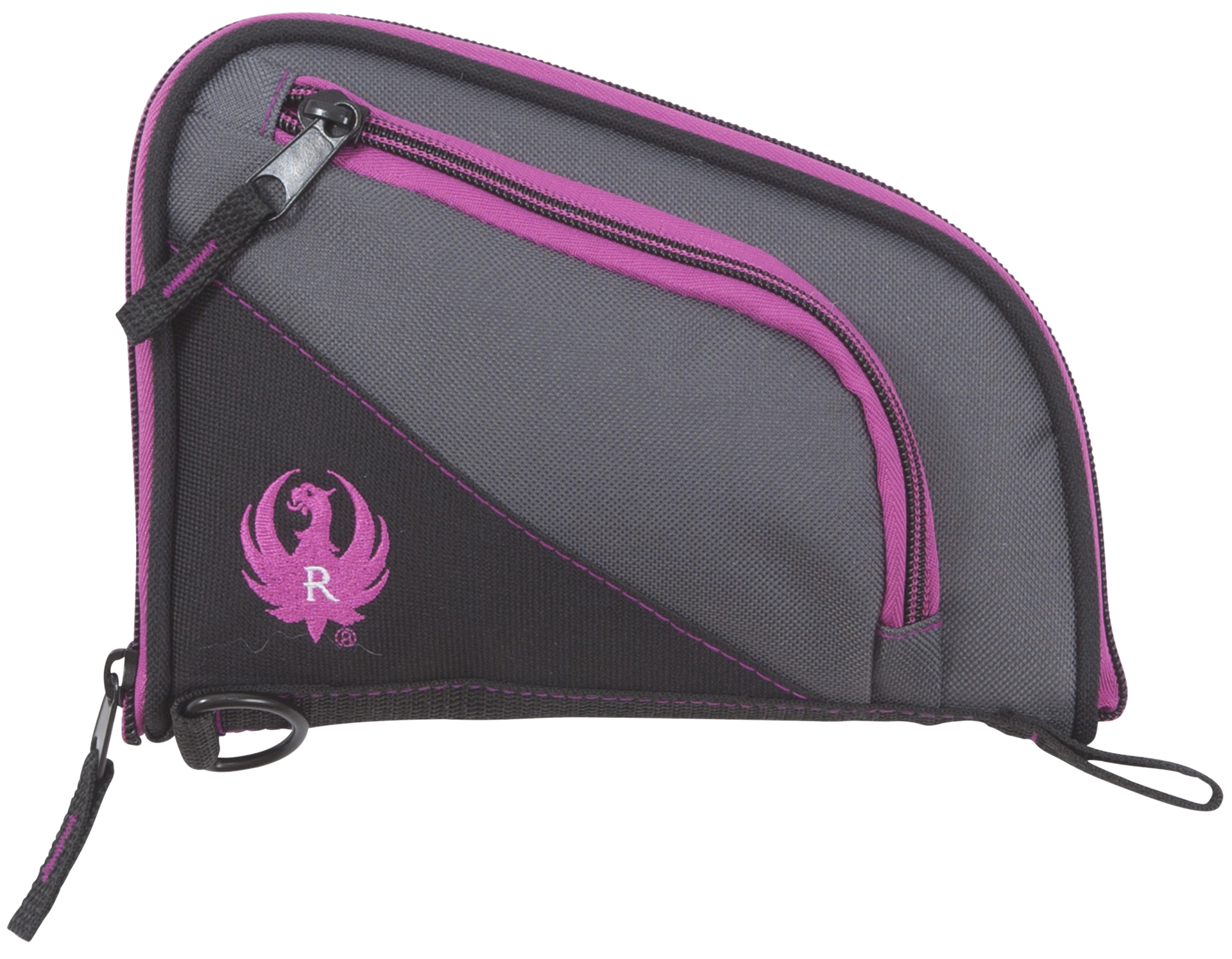 The ruger tucson women's handgun case is black and gray with orchid accents and has a soft knit lining to protect your firearm.Comes with a barrel protecting pocket, and an exterior storage pocket, plus the case is lockable inside.