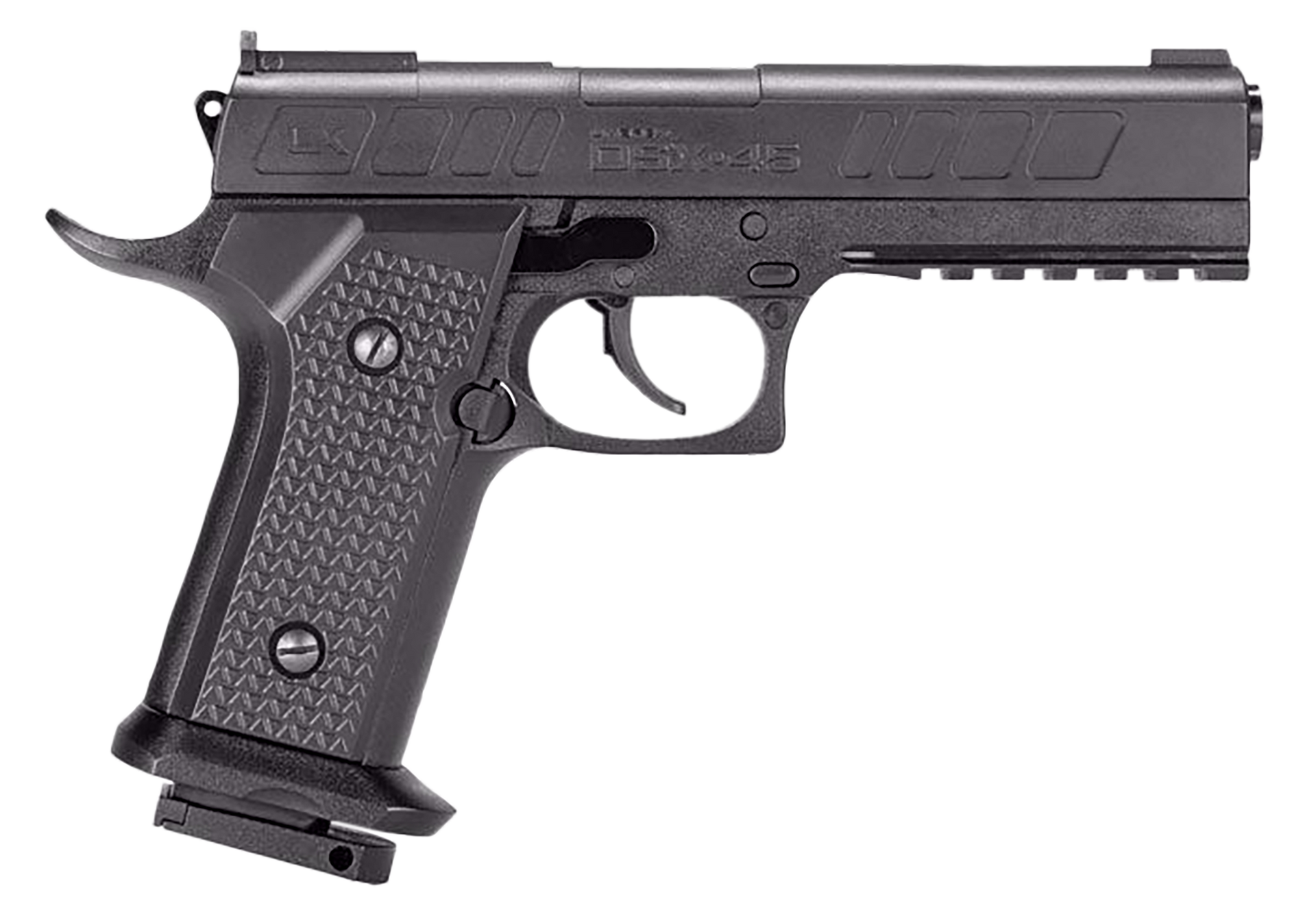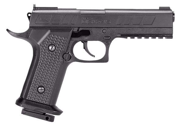 The umarex dsx45 bb gun is designed for casual shooting and beginner training and resembles the modern 2011-style handgun with a flared mag well.This airgun is a perfect choice for those new to the sport of airgun shooting, offering a blend of safety, simplicity, and fun.It's modeled to provide a feel similar to traditional handguns, making it an excellent tool for basic handgun training and target practice.With a large, 200-round capacity reservoir in the drop-free magazine, you can enjoy extended shooting sessions without the need to frequently reload.It features a 240 feet per second velocity, blade and ramp front sight and a fixed open rear sight for basic targeting and is equipped with a manual trigger block safety.