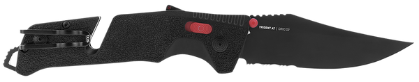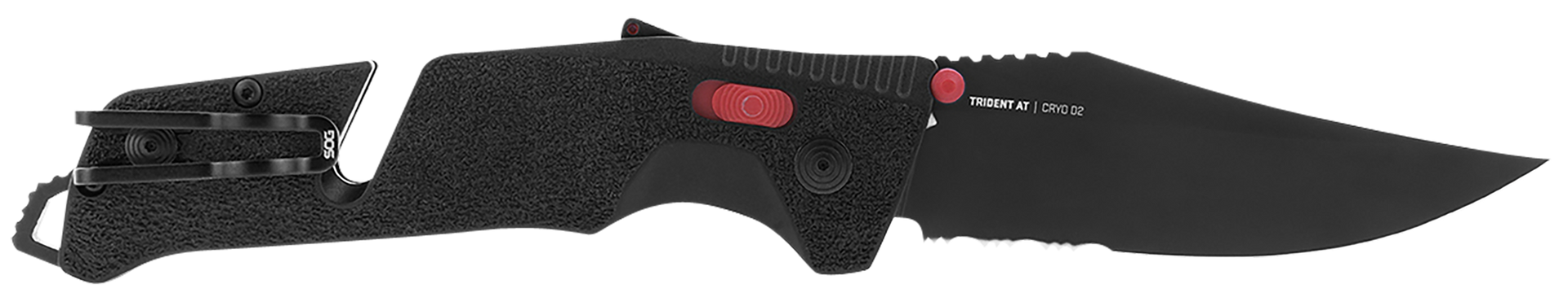 A folding knife designed for professional users, trident at features rapid assisted opening with sog's innovative ambidextrous at-xr lock, as well as integrated line cutter and glass breaker.Trident at is easy to carry, with a highly functional 3.75" cryogenically heat-treated d2 stainless steel blade.Its powerful at-xr locking mechanism also features built-in blade locking safety and spine-mounted safety system.Features lanyard loop, line cutter, glass breaker.