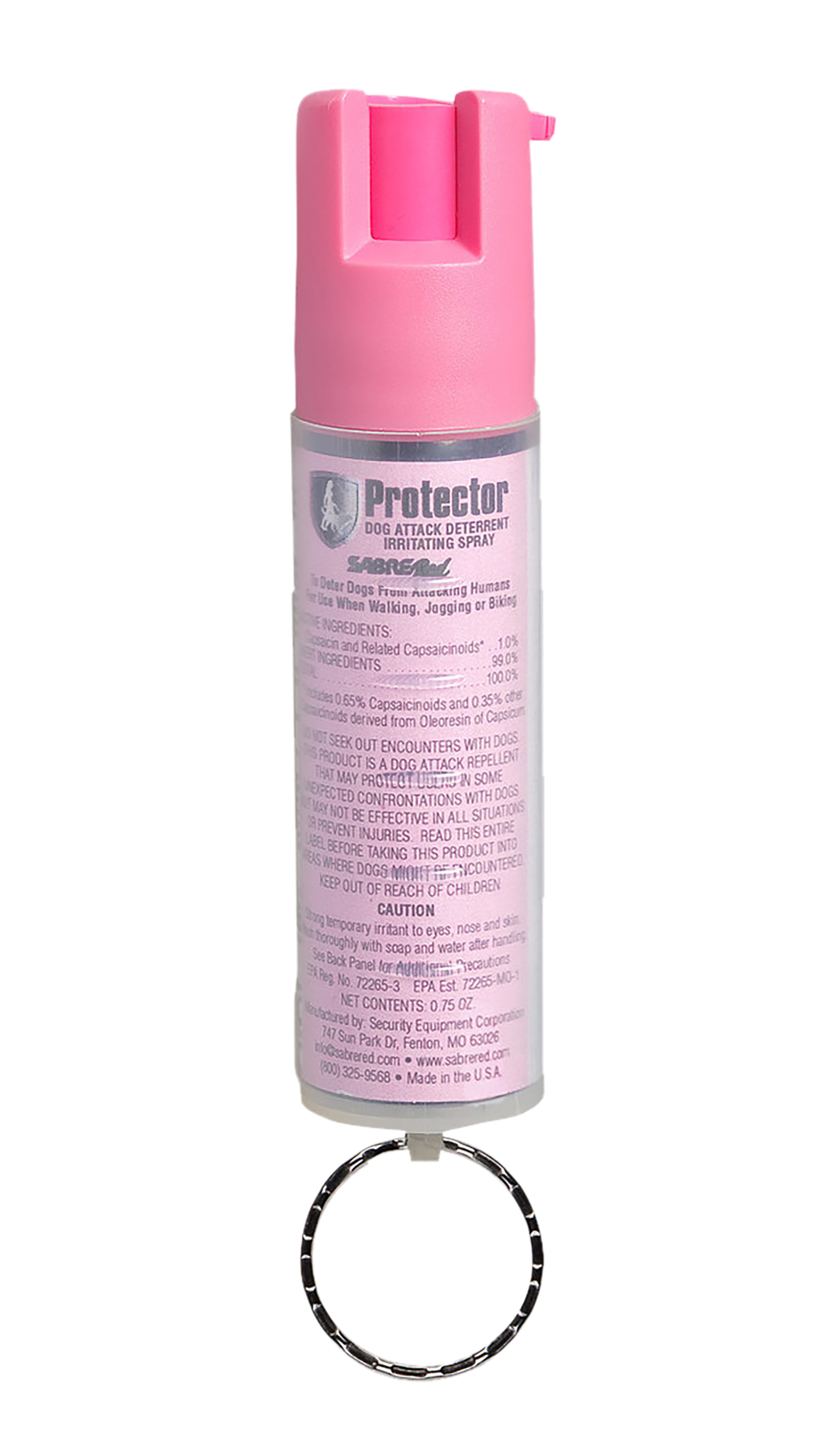 Sabre protector is a safe, yet effective, solution to help deter dog attacks while enjoying the outdoors.It has 1% major capsaicinoids - the maximum strength allowed by the epa.Protector is strong enough to deter attacks, from dogs of all sizes, without causing long-lasting injury or pain to the attacking dog.These are the two qualities consumers want most.The small canister includes a key ring attachment for...View more