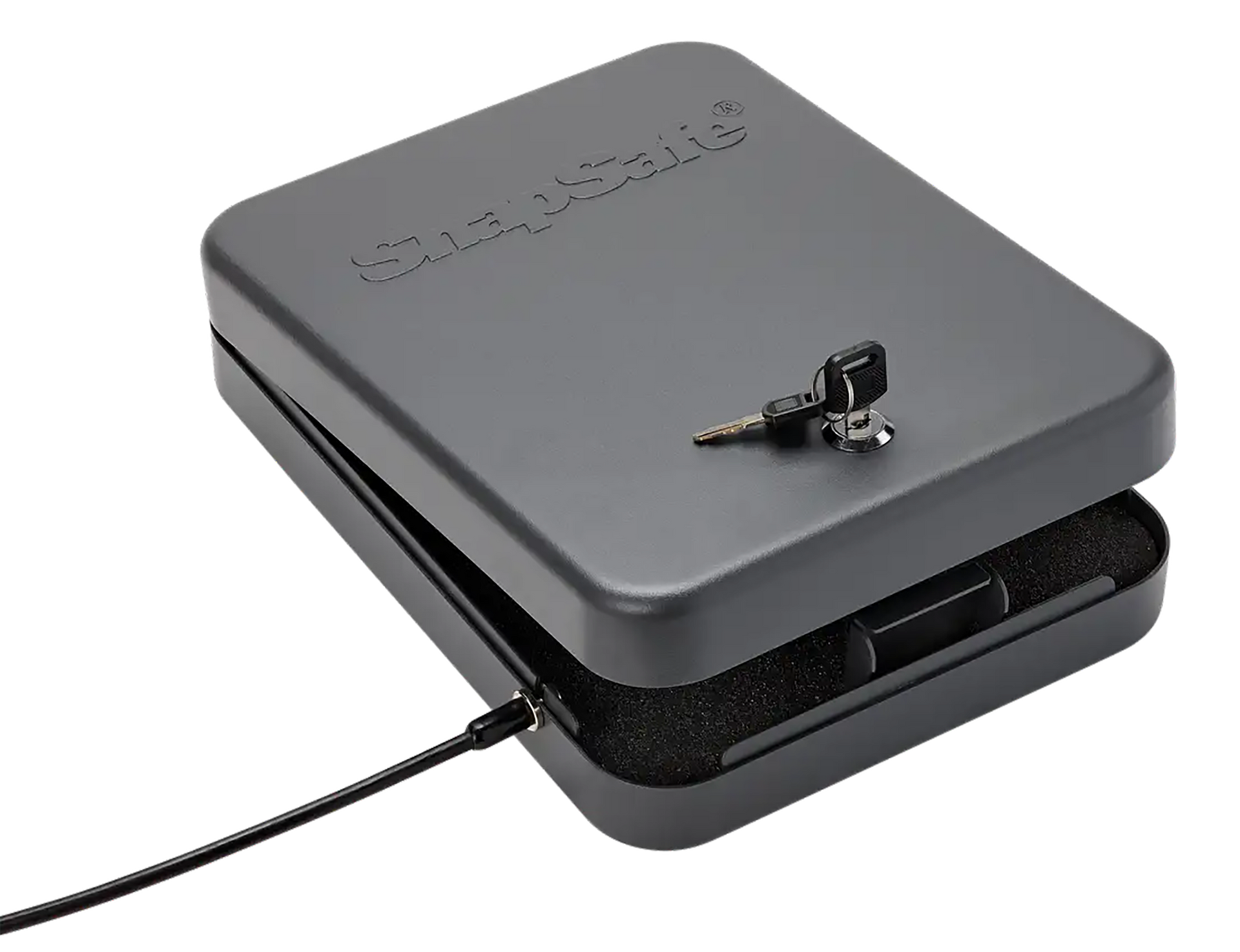 The snapsafe lock box provides secure storage for handguns and other valuables at home, on a nightstand, in the car or when traveling.It is constructed of thick 16 gauge steel with an easy to operate steel key lock mechanism and protective foam interior.The snap safe lock box meets tsa airline and california doj approved guidelines for firearms storage.It comes with a heavy duty 1500 lb.Rated steel cable that secures to any stationary object including a vehicle seat or heavy piece of furniture.Includes two keys.