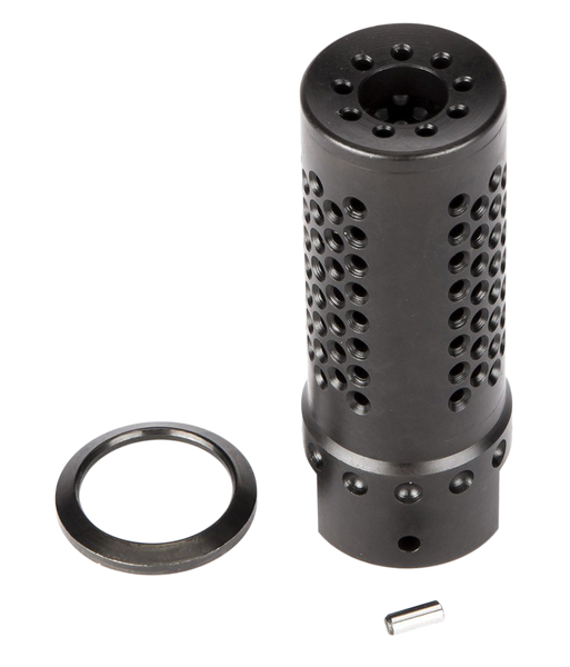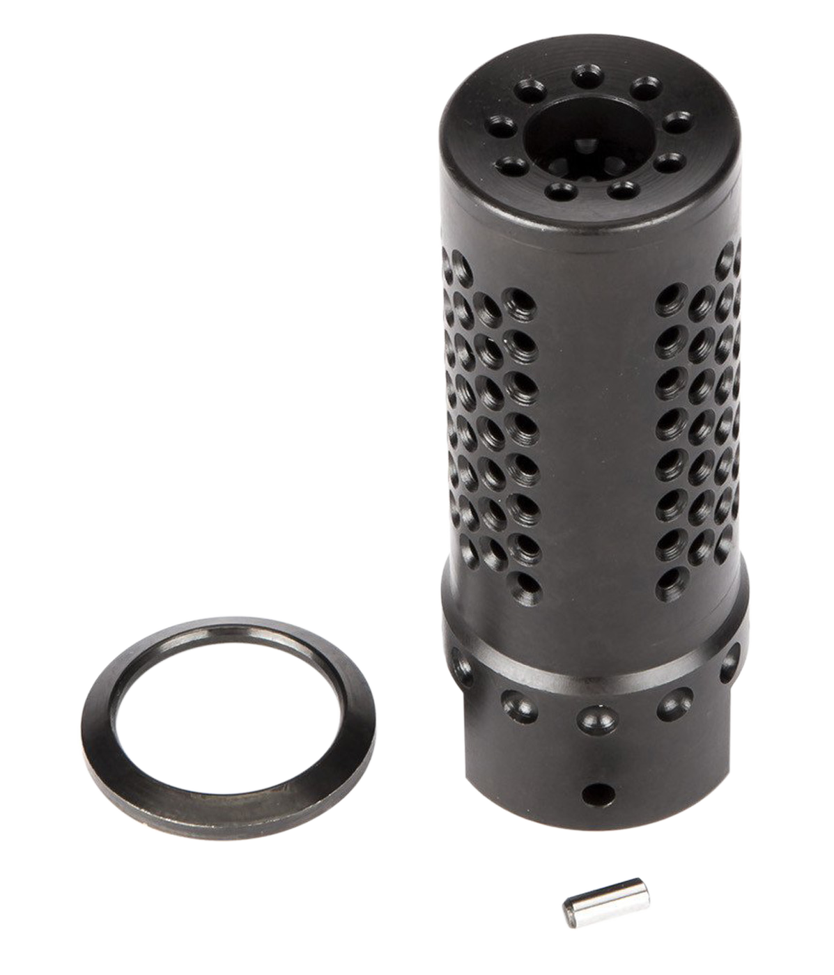 The spike's tactical dynacomp is a muzzle device designed to reduce recoil impulse and muzzle climb to provide faster follow up shots.The dynacomp accomplishes this by balancing the direction of the blast along the vertical (upward) and perpendicular planes of the muzzle to lower muzzle rise, while the end of the device restricts forward energy to reduce parallel recoil.The ports on the dynacomp are ball dimpled for smooth expansion of gases and rapid heat dissipation.The front of the device is 0.25" thick to better handle the abuse of full auto fire.This model is for.308 rifles and is threaded for 5/8"x24 barrels.It is machined from 303 stainless steel and features a black melonite finish.It comes with the crush washer needed for installation.