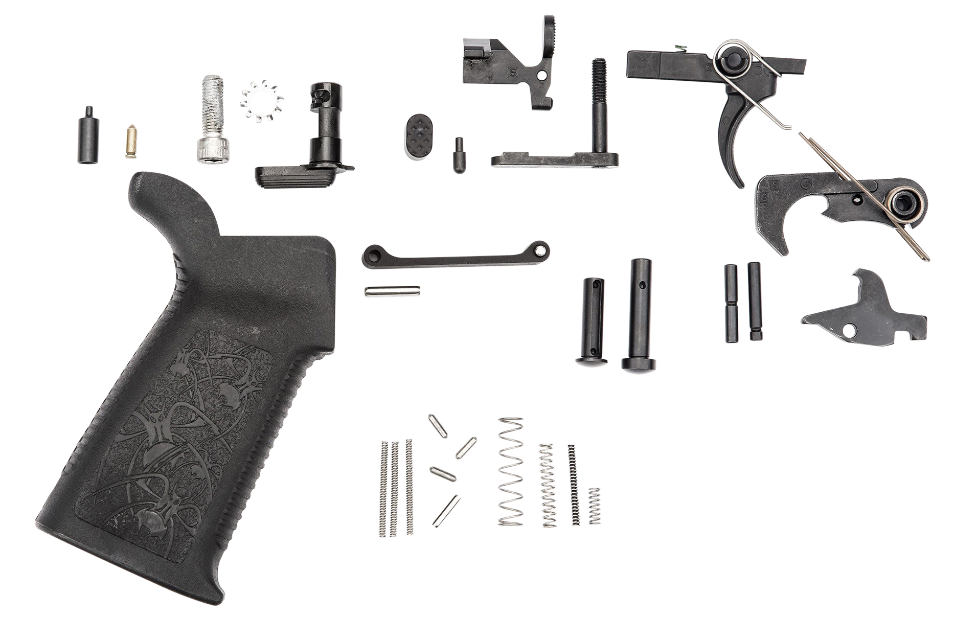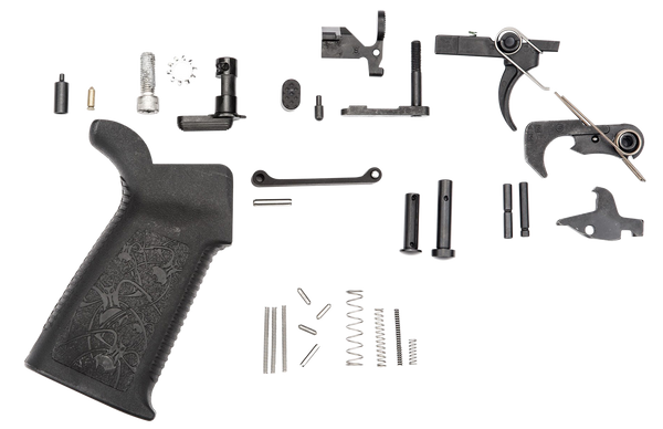 Spike's standard lower parts kit exceeds military specifications by a long shot while also offering a much better fit and finish.It includes: rounded hammer (works with all calibers), hammer spring, trigger, trigger spring, disconnector, disconnector spring, safety selector, detent, selector spring, bolt catch, bolt spring, roll pin, plunger, magazine catch, catch spring, catch button, front pivot pin, rear takedown pin, aluminum trigger guard with spring loaded detent and roll pin, buffer retainer spring and plunger, a2 pistol grip, 1/4x28" hex screw, star lock washer, and stainless steel hammer and trigger pin with black oxide finish.Made in the usa.
