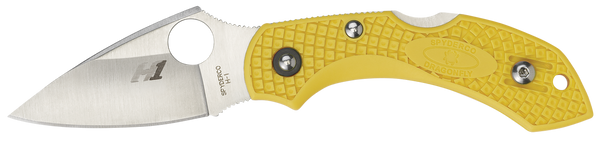 The spyderco dragonfly 2 is being offered with an h-1 blade option, called the dragonfly2 salt.What makes the dragonfly a bestseller is its mid-sized blade, ergonomic handle with a front-finger choil and a spine cusp.Its blade-to-handle geometry and leveraging points fill a gripping hand, making it feel like you're cutting with a much larger knife.Its frn (fiberglass reinforced nylon) handle is molded with a grip pattern called bi-directional texturing' that ergonomically fills the hand with a series of angles and leveraging spots and is available in marine yellow.The addition of textured jimping on the choil, spine and screw-together handle construction and a left/right tip-up wire clip make pocket carry effortless and convenient.Precise positioning of the enlarged spyderco round opening hole in relation to the pivot makes opening/closing smooth.Hollow-ground for high cutting performance, the blade comes in a spyderedge configuration.