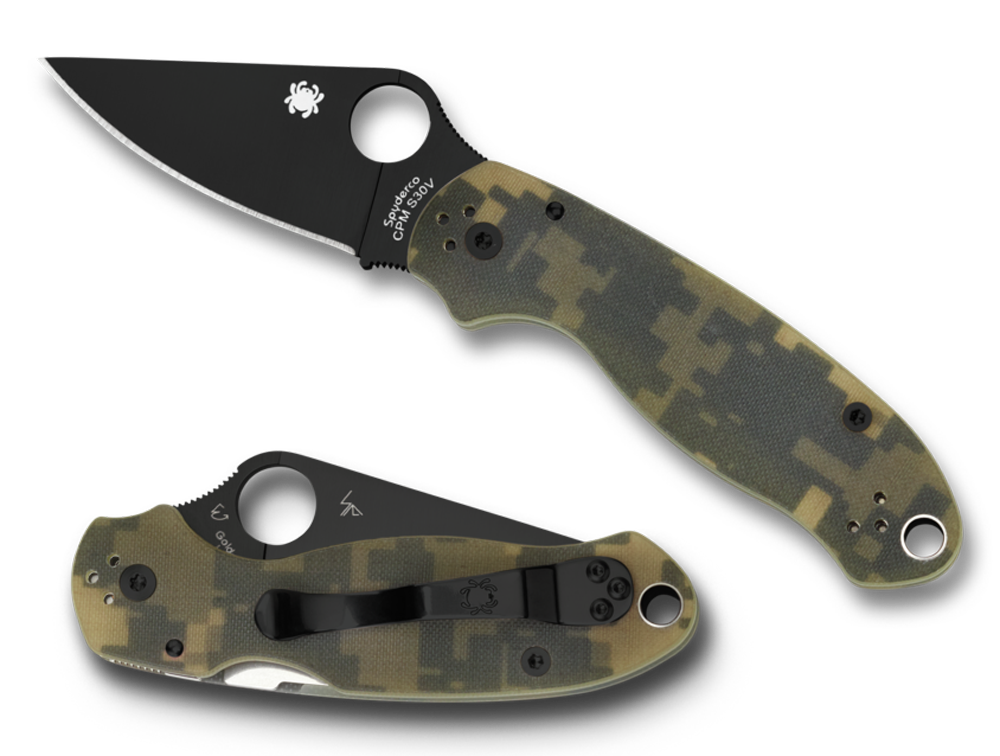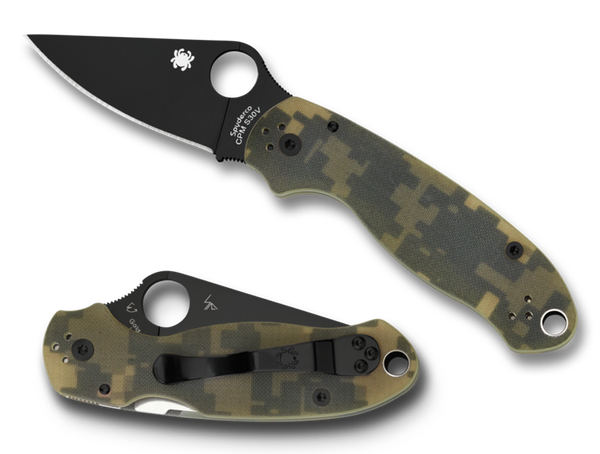 This expression of the para 3 is specifically designed for applications where light discipline is a concern.Its cpm s30v stainless steel blade is cloaked in a tough, non-reflective diamond like carbon (dlc) coating and its handle features textured g-10 scales with a digital camouflage pattern inspired by the u.S.Armys arpat pattern.All other features are consistent with the standard version of the para 3, including a full-flat grind for exceptional edge geometry and low-friction cutting performance, a fully accessible trademark round hole for swift, ambidextrous, one-handed opening, a high-strength compression lock mechanism and a four-position hourglass clip that supports left or right-side tip-up or tip-down carry.