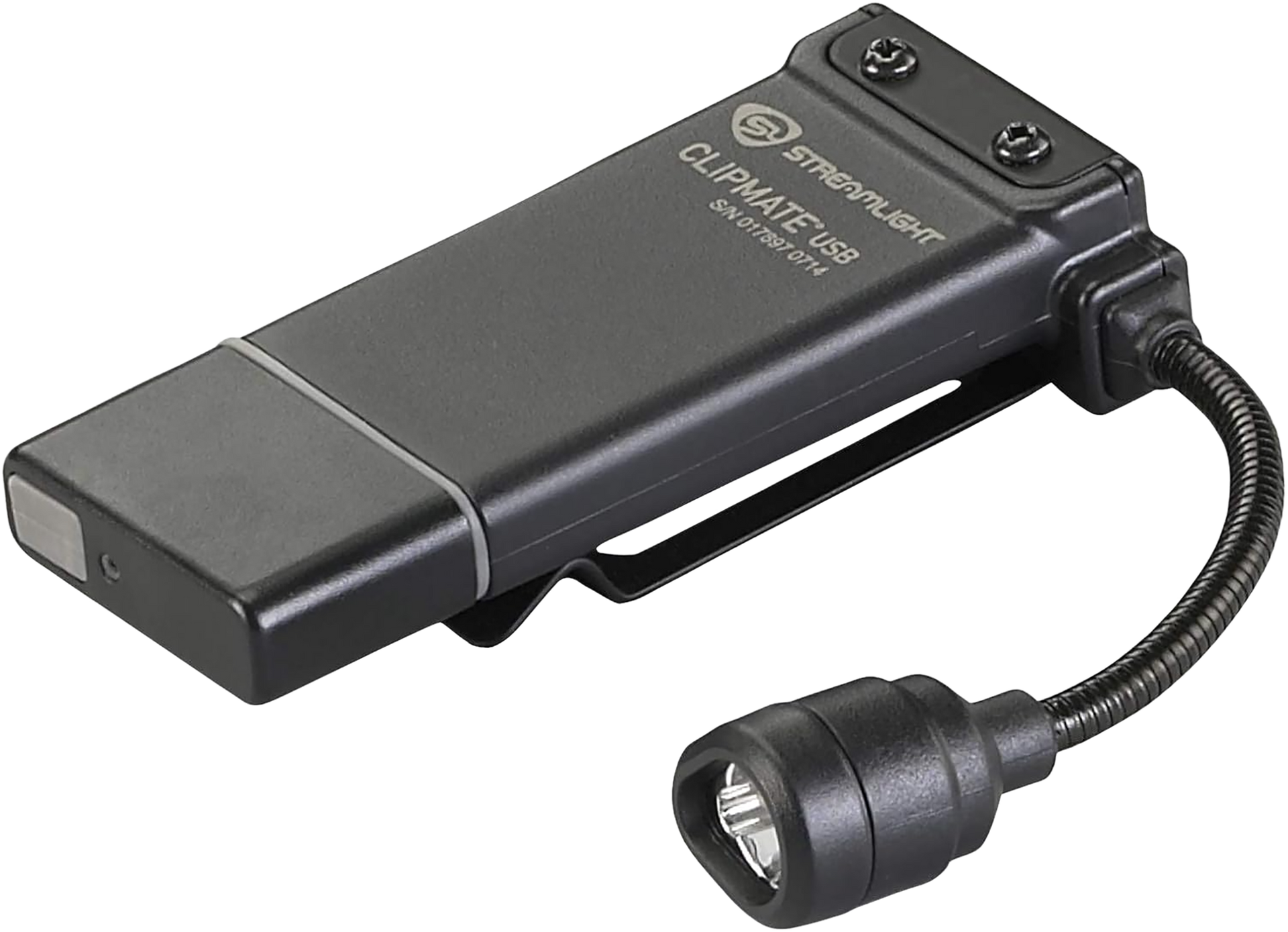 The clipmate usb is a sleek compact usb rechargeable, lithium polymer battery powered flashlight with a flexible neck designed to put light where you need it.The light is robust in design for use in all markets.It features a multi function switch, a pocket clip for convenience, and amazing brightness and run time for a light of its size.With its built in usb charge tab, there is no need for a cord to recharge the light.Its polymer housing makes the light extremely durable, abrasion resistant and light weight.Lithium polymer cell fully recharges in-product in 2.5 hours; rechargeable up to 300 times.
