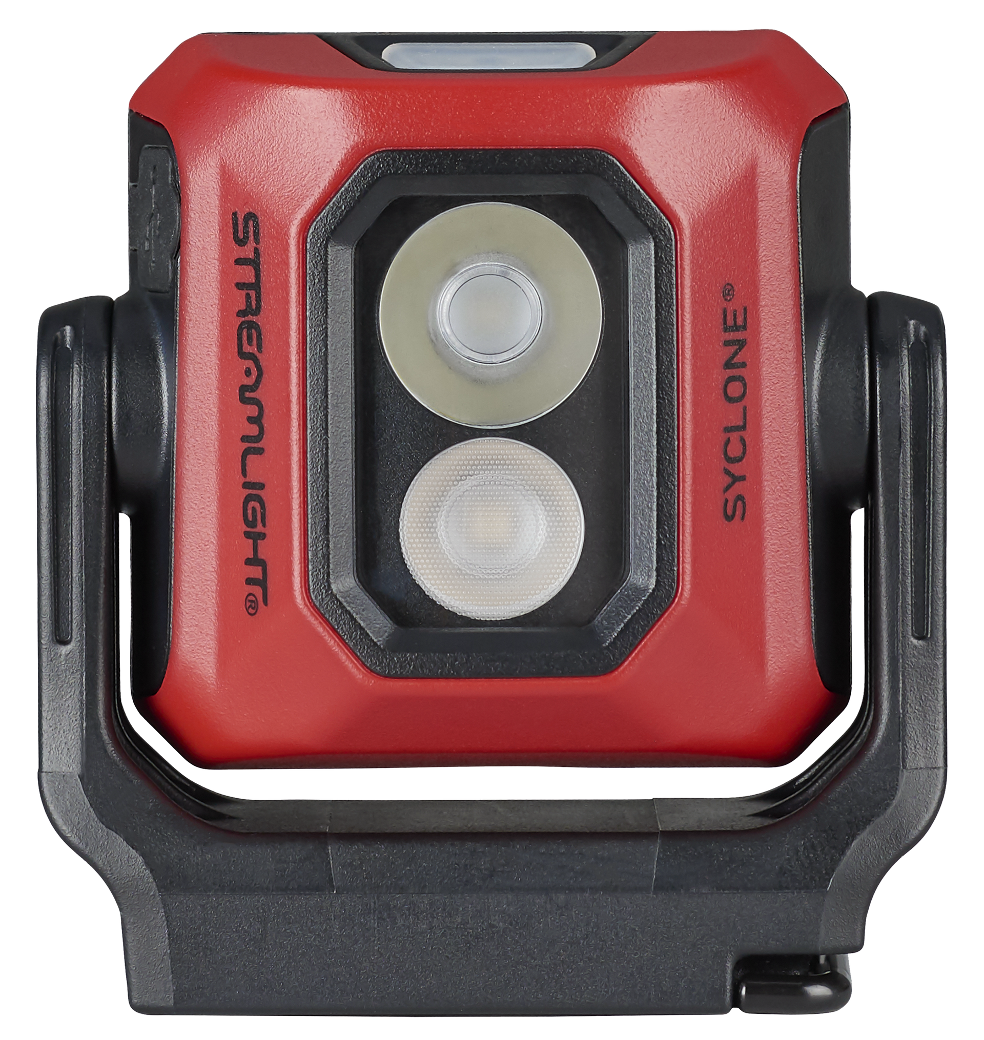 The syclone uniquely features spot and flood leds for a total of six output modes.There are three light levels each for spot and flood.The spot beam uses a cool white led for max illumination, while the flood mode uses a 90 cri led for better color recognition.Battery charging is effortless, just pull open the rubber usb cover and plug in the charge cord.Charge indication is provided in the on/off button with red for charging and green for charged.In use, the colored leds in the button show battery power remaining.Green, yellow, red and blinking red when charging is needed.The body of the syclone can rotate 360 in the u frame and is adjustable using one hand.Detents hold the light in your desired position, and the light will stand on its base.The base includes magnets that will hold the light on any convenient ferrous metal surface (in any orientation) to provide task specific illumination.Theres also a handy folding hook to hang the light by for added versatility.