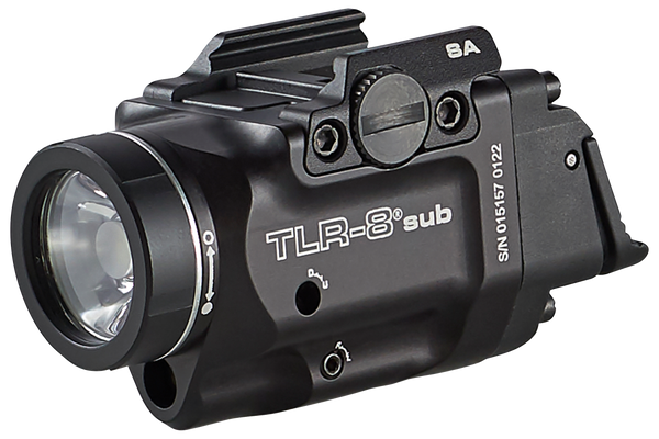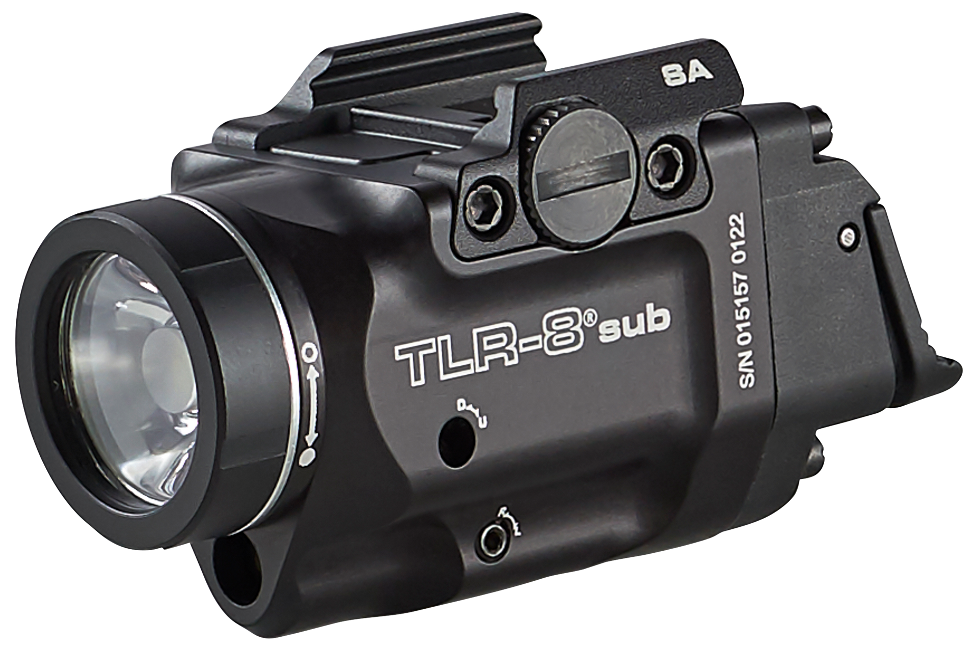 The streamlight tlr-8 sub produces a narrow beam with optimum peripheral illumination.Featuring next generation rear paddle switches with high and low options; white led and red aiming laser; safe-off feature prevents accidental activation, saving batteries and rail clamp system securely attaches/detaches quickly and safely with no tools and without putting your hands in front of muzzle.Includes mounting kit with key, cr123a lithium battery and interchangeable paddle switches easy to swap out with multi-tool.