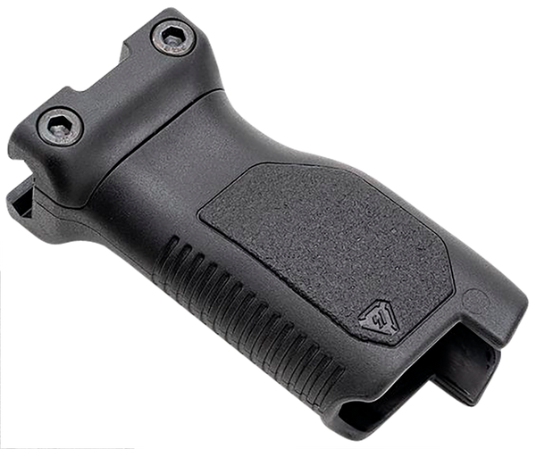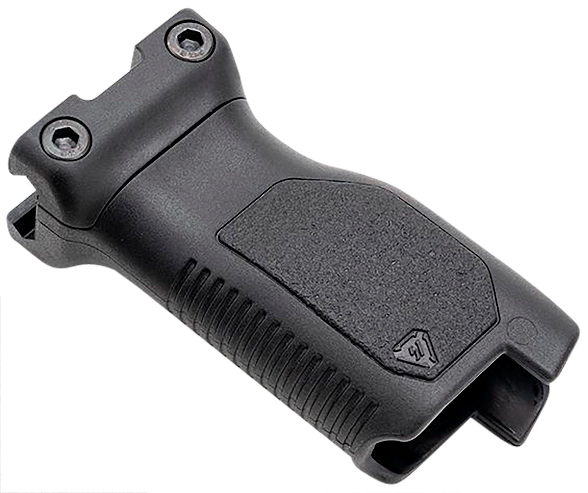The strike industries angled vertical grip with cable management is engineered like no other grip on the market.The grip angle sits on the handguard at 86 degrees.Patent pending si cable management function enables you to organize and store excess wire from your weapon light or any other cabled accessories in multiple configurations.Instead of tucking wire anywhere you can and using cable ties or tape to hold it down, the cable management feature will offer you a place to route and/or contain loose wire inside the grip cavity.The side cuts at the top middle of the grip allow for easier pressure switch attachment.The long version has an added built-in stability feature when you place the l-shaped bottom onto a table edge/corner or as a barricade stop, giving you another way to get back on target faster downrange