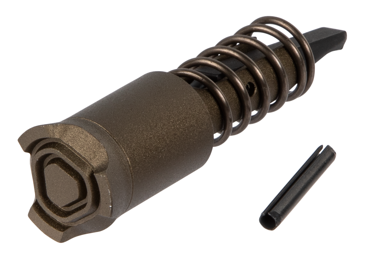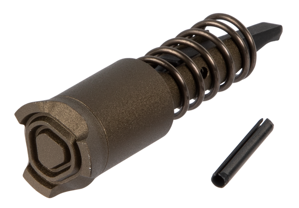 The strike forward assist plunger is made of lightweight aluminum for those looking to retain the functionality of a forward assist, while seeking weight savings wherever they can.The pawl is constructed of tool steel to ensure positive engagement of the forward assist ratchets on compatible bolt carriers and maintain long service life.Installed pawl and spring.Includes plunger, spring pin.