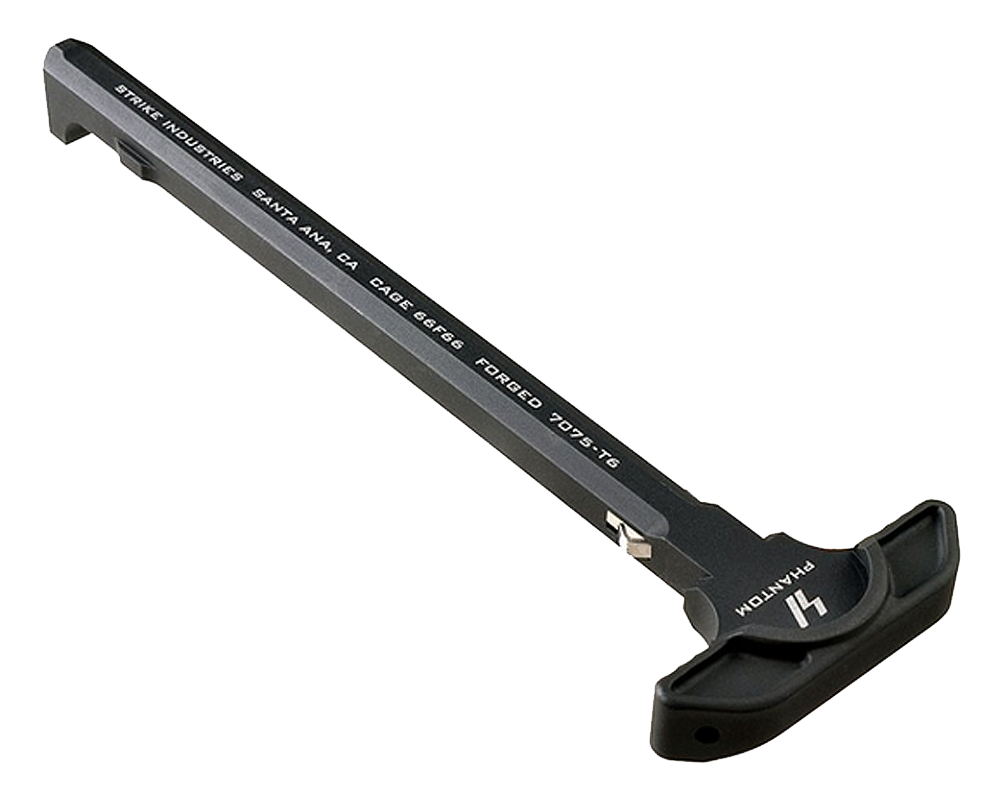 Simple in its execution, yet robust and reliable, the revolutionary strike latchless charging handle offers forged 7075 construction, efficient side gas venting, and a solid, comfortable interface for the user.Reliable receiver lockup is achieved through a novel hidden spring mechanism that uses the charging handle insertion slot in the upper receiver charging handle channel.This channel features a natural radius that will not wear rapidly like the external, 90-degree edge of the standard ch latch area of the upper receiver.The flat spring bearing surface is much larger than a steel ball bearing, spreading force and wear out over a larger area.Increased service life is one benefit of this type of system, as is the comfort and peace of mind that come from a lack of moving or external components that can break or snag/catch on your gear and foreign objects.The solid aluminum construction is durable and provides a solid mounting point for the iso tabs, an add-on component that increases surface area for those using large optics and/or gloved hands.Note: for standard mil-spec ar15 rifles only.Not rated for suppressors and/or full auto fire.Not for use on sbrs or pistol length barrels (<14.5").This model has a black finish.