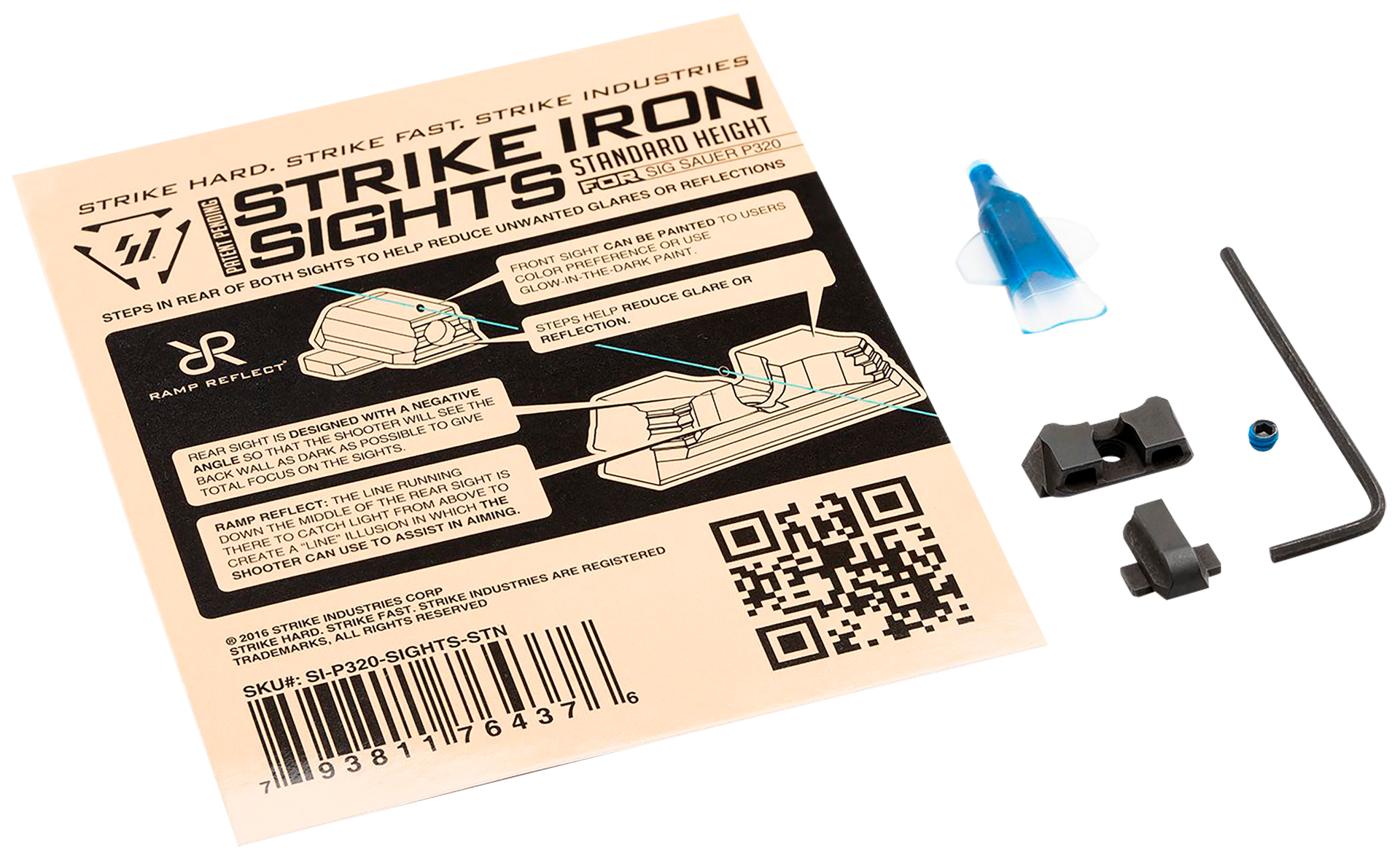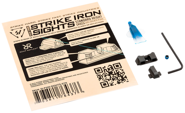 The strike iron sights (standard height) give you the best affordable option so you can throw away those plastic (glock) or boring oem steel sights.Designed to help with proper sight alignment and keep the shooter's eyes focused, there is natural light that is seen on both sides of the front sight between the u-notch rear sight.Steps placed in the rear of both sights help angle and reduce unwanted glares or reflections out of your eyes.Lines and angles designed to use natural light reflections and shadow play to keep user's eye aligned and focused on the target.The rear sight is designed with a negative angle so that the shooter will see the back wall as dark as possible to give total focus on the sights.The line running down the middle of the rear sight is there to catch light from above and create a "line" illusion in which the shooter can use it to assist in aiming.The front sight can be painted to users color preference or use glow-in-the-dark paint to customize the look and use of the sights.Made from sus630 hardened stainless steel, the strike iron sights (standard height) is engineered to be as robust as possible while giving you one of the most budget friendly options on the market.Front sight length: 0.542".Front sight width: 0.472".Front sight height: 0.218".Rear sight length: 0.403".Rear sight width: 0.819".Rear sight height: 0.248".Weight: 0.20 oz.Fits: sig sauer p320 with rear dovetail.