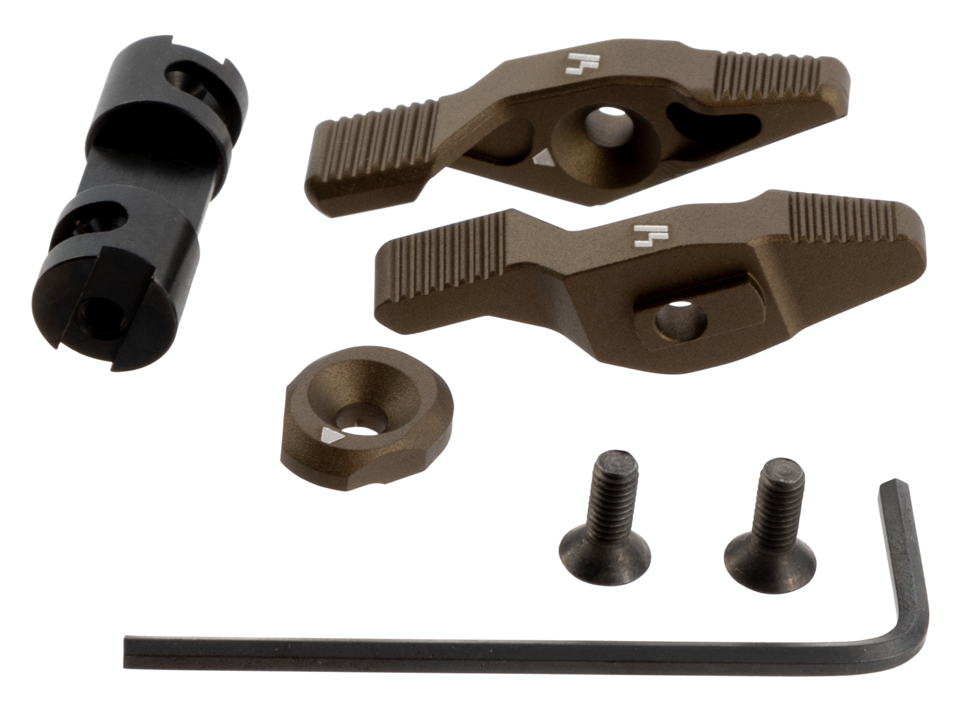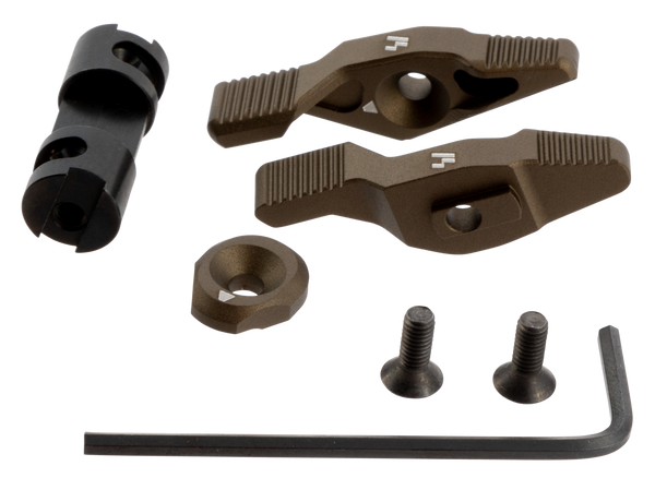 The strike switch is a patent pending modular safety selector designed from inception using human factor considerations to aid positive on safe, on fire manipulations.The unique toggle action allows one to quickly engage the safety when moving positions without altering the firing grip.The extended lever arm serves as an index point and thumb rest in either position.The levers are machined from lightweight, but strong aircraft grade aluminum and the safety shaft itself is machined from high strength steel.
