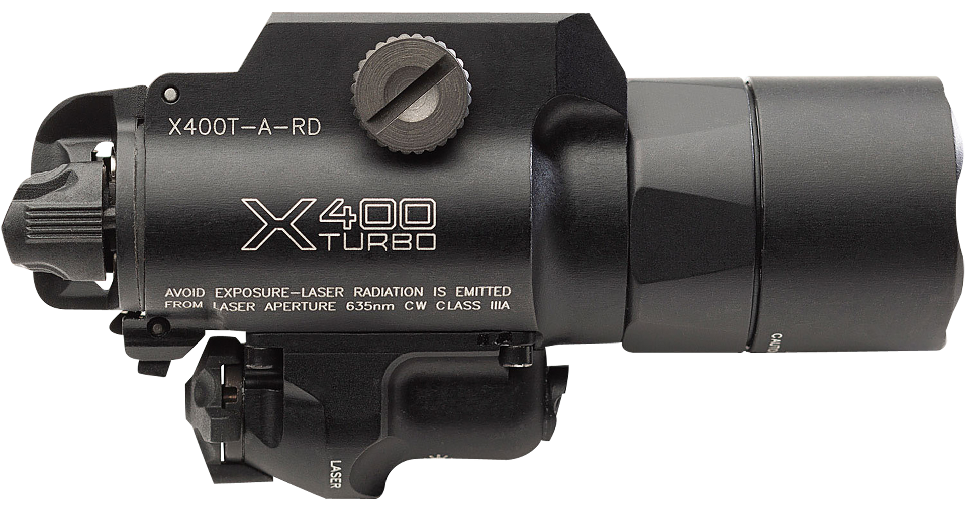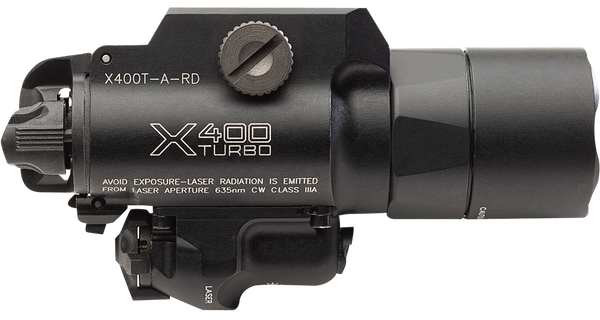 Pinpoint the threat.The turbo series version of our x400 handgun weapon light delivers a stunning 66,000 candela of intense, tightly focused, far-reaching white light with a hot spot that is tremendously effective, plus a highly visible laser available in red or green to help the user get on target quickly and accurately.You can count on the x400t-a-rd to help you positively identify threats at extreme distances while also providing ample spill light to help you maintain situational awareness, and you can trust its laser to provide crucial visual guidance without acquiring your sights if you're forced to respond from a non-standard shooting position.Ambidextrous switching provides one-finger control of momentary-on or constant-on activation.Its rugged, aerospace aluminum body is mil-spec hard anodized for scratch and corrosion resistance and sealed to make it weatherproof.The x400t-a-rd delivers a standard of excellence you can trust with your life.