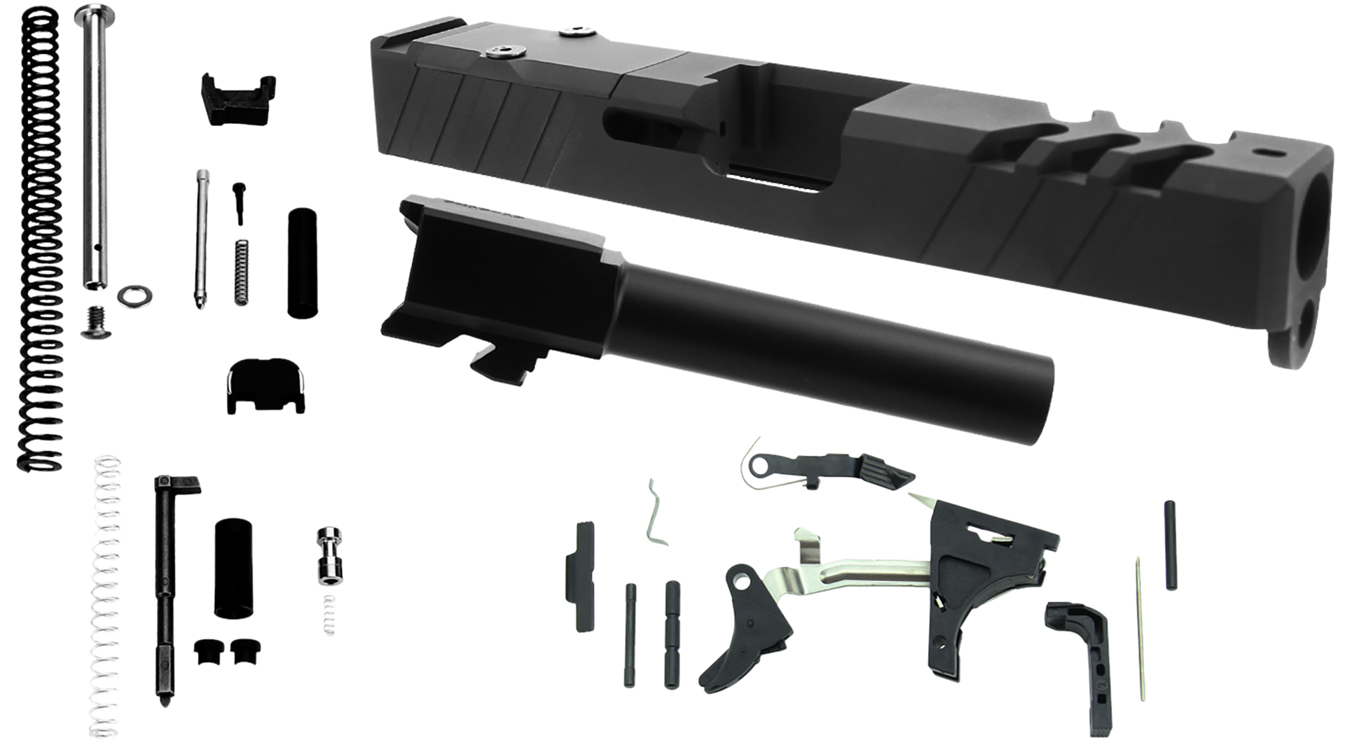 (1) stripped glock 19 compatible rmr cut slide w/cover plate (1) glock 19 compatible 9mm barrel (1) glock 19 upper parts kit (1) glock 19 lower parts kit
