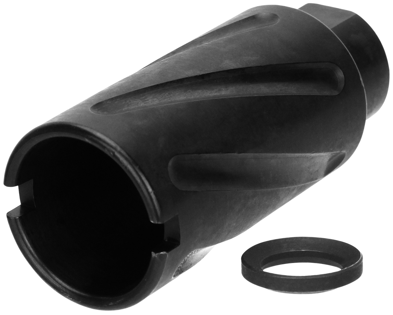 This 1-piece krinkov style muzzle brake is made of an all steel construction with a heat treated, erosion resistant, black oxide finish.It comes with a 1/2"x36 thread pitch, and is designed to reduce recoil along with barrel whip.