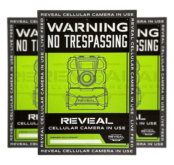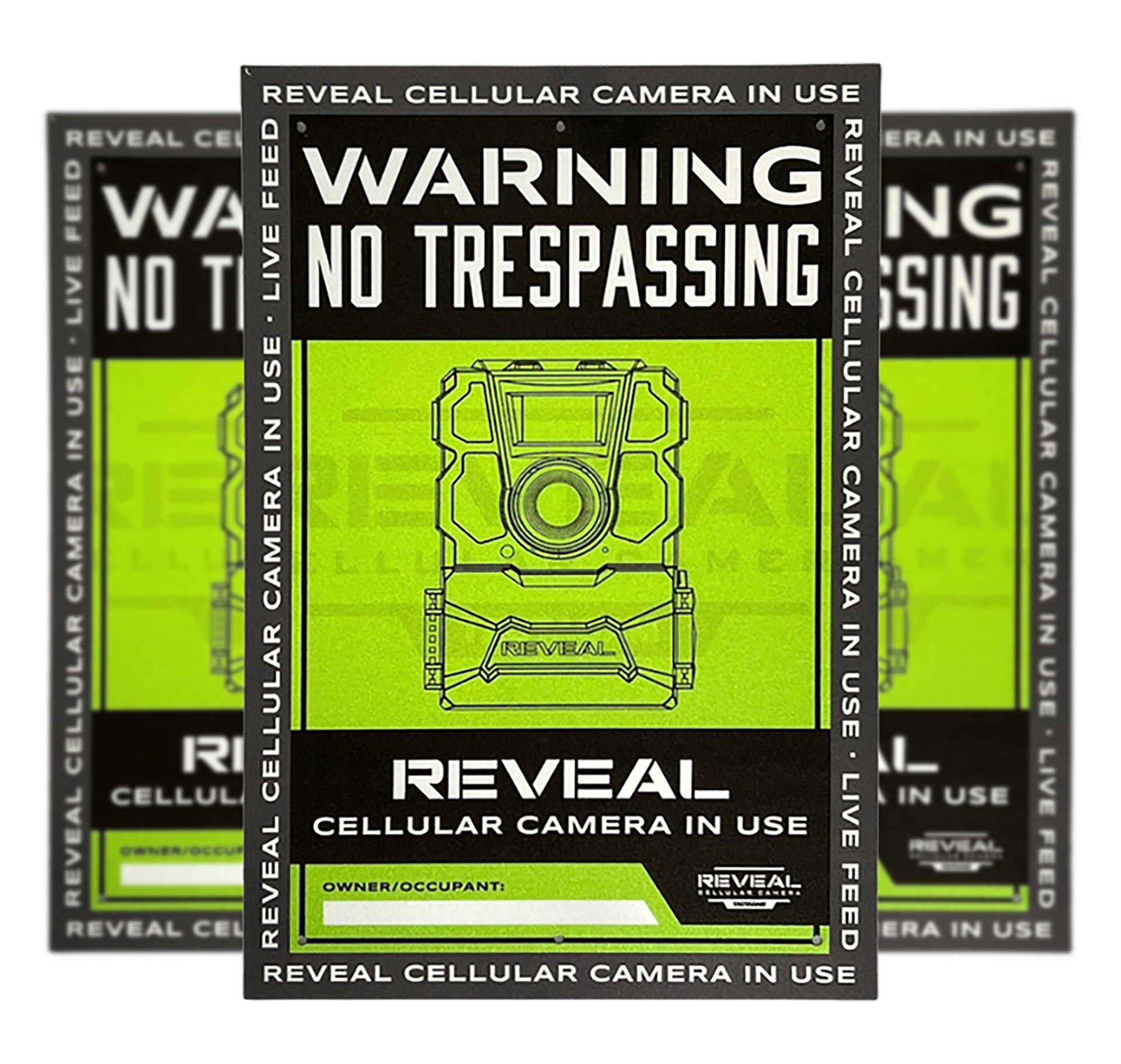 Tactacam's reveal no-trespassing signs inform potential intruders of active reveal cellular cameras in the area.Protect your property with high visibility signage