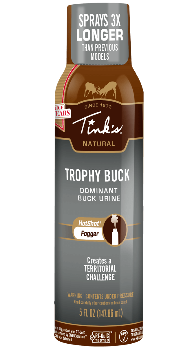 Tink's trophy buck fogger is designed to dispense 100% pure lure without any contamination.Not mixed with any propellants, the fogger offers an adjustable spray-rate so you control the attraction.All natural dominant buck urine with an innovative actuator system to dispense scent in short bursts or lock it down for maximized attraction.Scent is dispersed as a mist for longer range attraction, sticking to everything in it's path.Sprays 3x longer than the buck bomb.