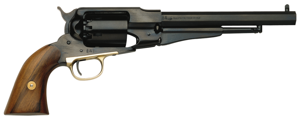 Designed to be the future of revolvers, the top strap, full frame design made the 1858 army revolver one of the strongest available.During the civil war, its eight inch barrel and reliability made it highly sought after.This particular model has an 8" octagonal blued barrel, steel frame, steel guard, and walnut grip.It has top strap/post sights and is.44 caliber.This revolver is 13.5" in length and weighs 2.75 lbs.