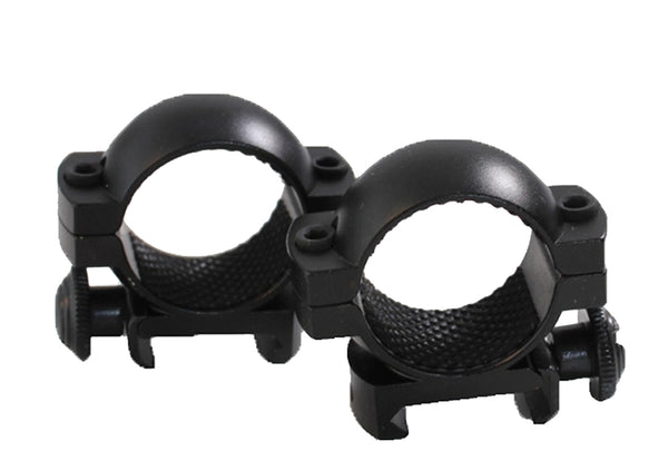 These are aluminum scope rings that fit weaver style bases.They are 1" in diameter, medium height, top-bottom style, with a matte black finish.
