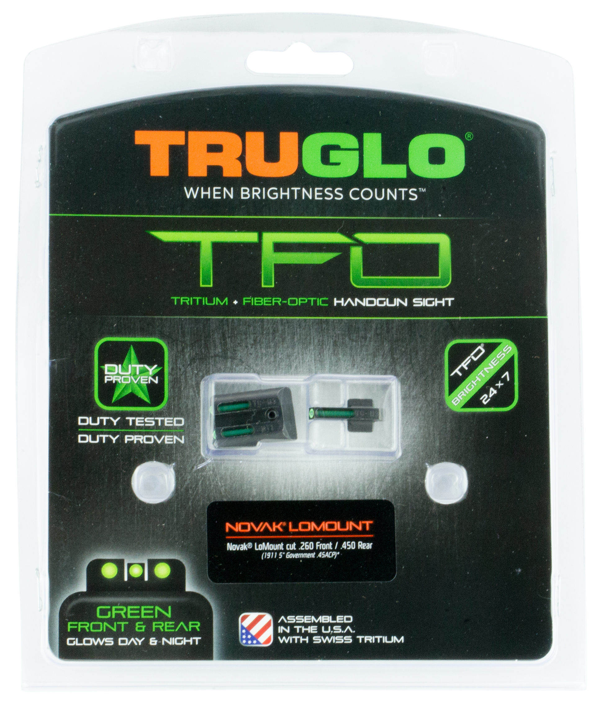 The better you can see your sights, the better you can shoot.We brought fiber-optics to the shooting sports industry decades ago for this very reason.Tfo pairs our fiber-optic sights with our tritium night sights to create a consistently bright sight picture day or night! our patented combination of tritium and fiber-optic technologies unites the best of both worlds providing the same bright sight picture whether you are in glaring daylight or complete darkness.Fits 1911 models -.270 front/.450 rear (1911 5 government 9mm /.40 s&w) front sight height: 0.270" rear sight height: 0.450".