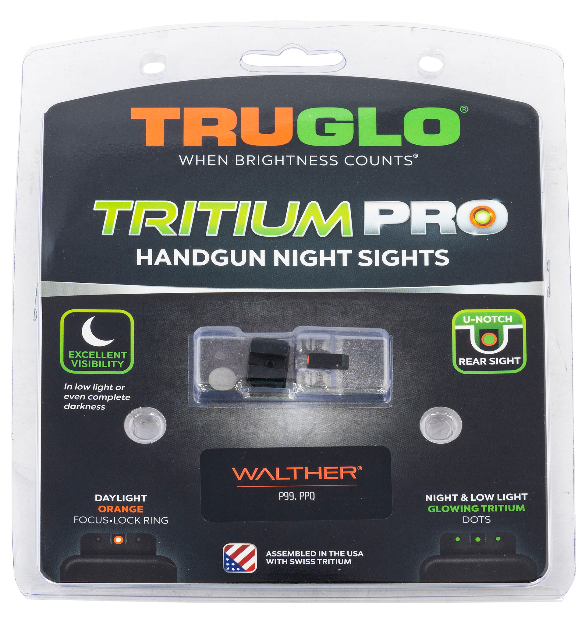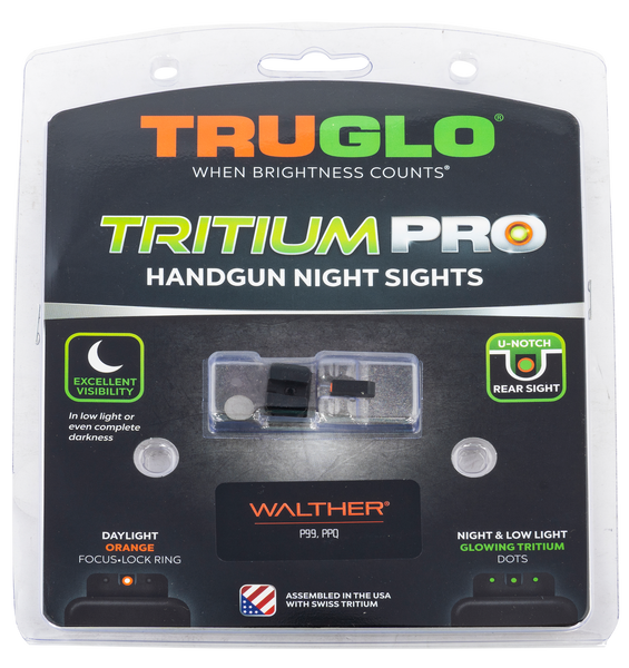 When the lights go out, your sidearm doesnt need to be left in the dark.Tritium pro night sights transition from standard white dot sights during the daylight, to glowing green dots in the dark.Tritium does not need batteries and does not need to be charged with light it simply glows! front sight focuslock ring for even faster focus.Assembled in the u.S.A.With quality swiss tritium for maximum brightness.Fits most standard holsters.Front sight length: 1.0".Front sight width: 1.0".Front sight height: 1.0".Rear sight length: 1.0".Rear sight width: 1.0".Rear sight height: 1.0".