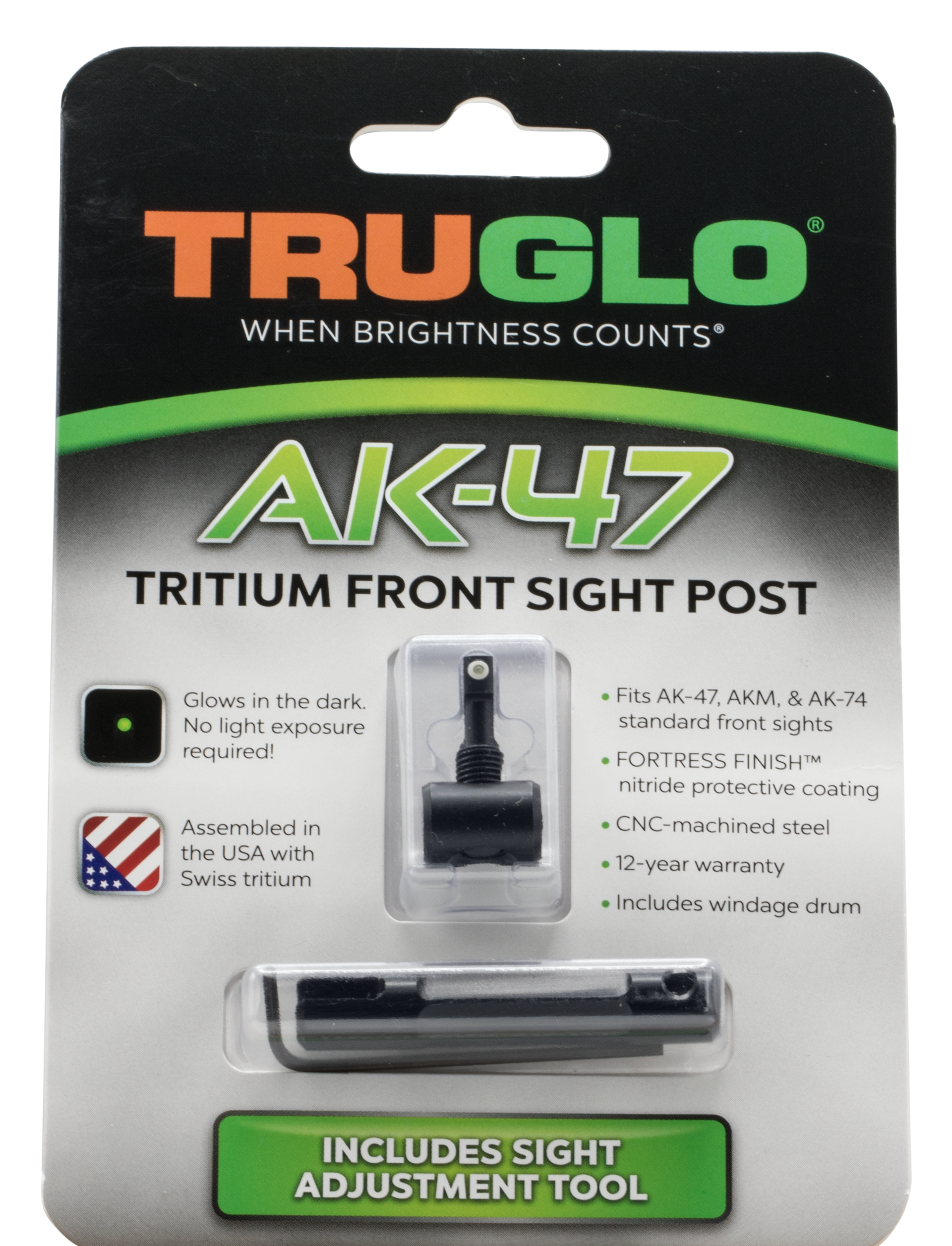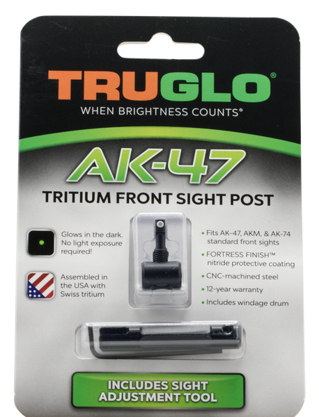 The tritium front sight glows in the dark and replaces your standard front sight post.Ak-47 rifle front sight post includes windage drum.It includes an adjustment/installation tool.Assembled in the u.S.A.With quality swiss tritium for maximum brightness.