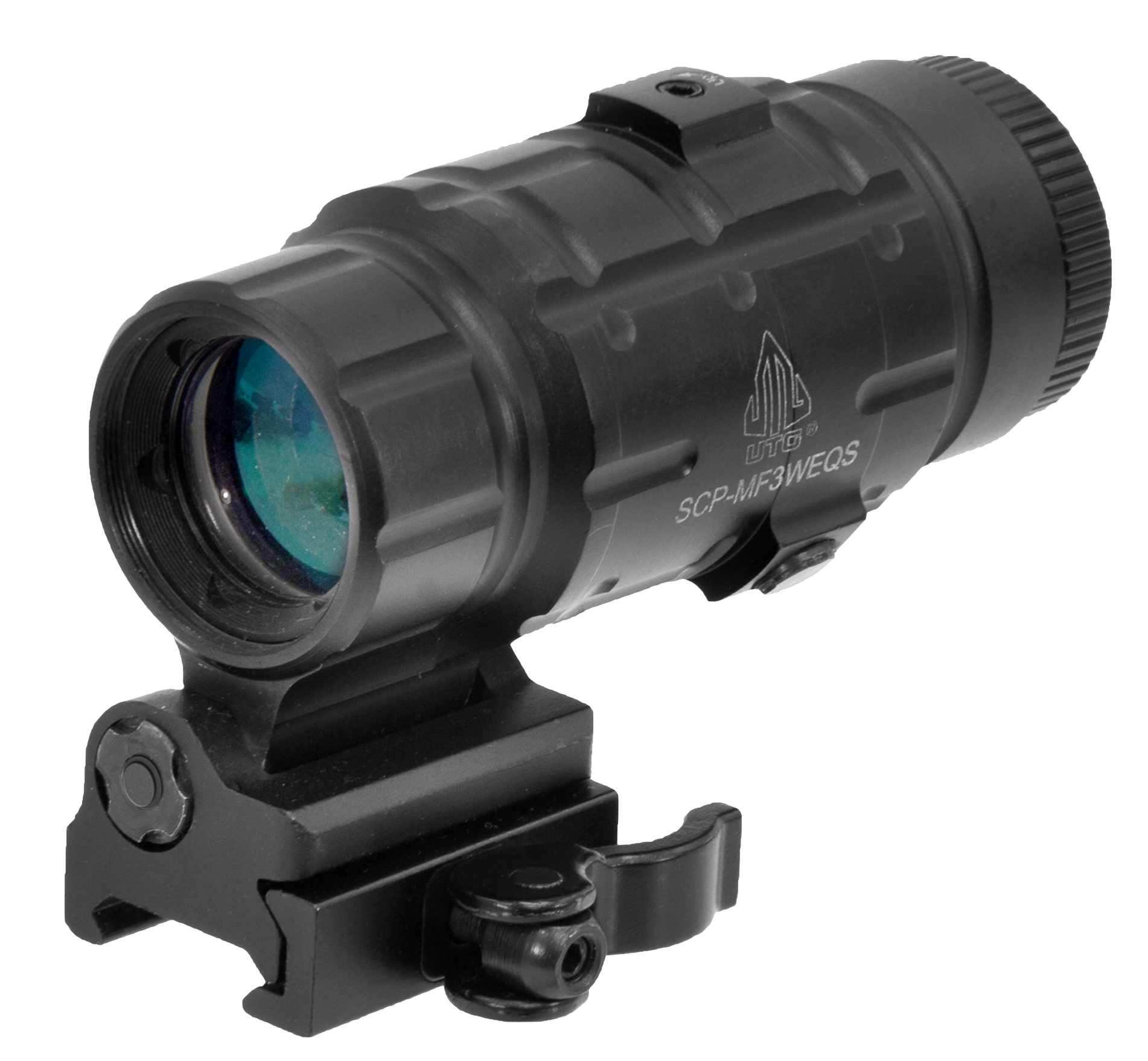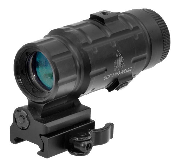 The utg 3x magnifier with a flip-to-side qd mount for quick transition between 1x and 3x image.Features a broadband multi-coated lens to provide crystal clear image, wide field of view, adjustable windage and elevation, adjustable eyepiece for easy dioptric correction and a patented quick-detach lever lock mounting base