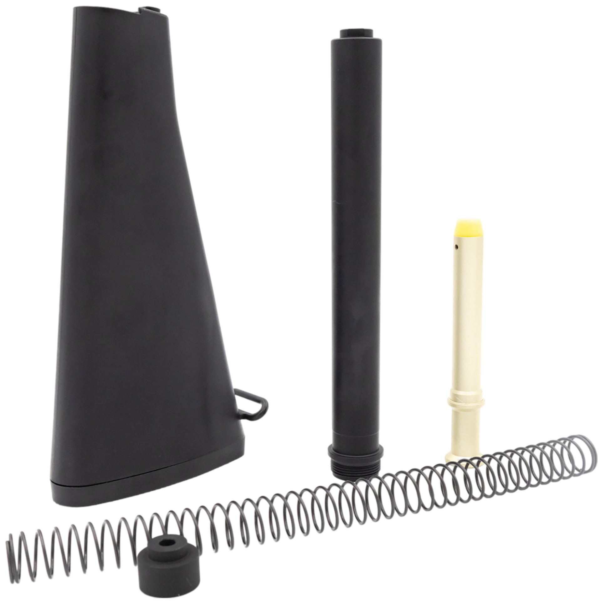 Leapers ar-15 standard a2 fixed butt stock assembly is molded from impact resistant advanced polymer.It comes complete with a2 extension tube, recoil spring, buffer assembly, stock spacer and screw and a storage pocket.