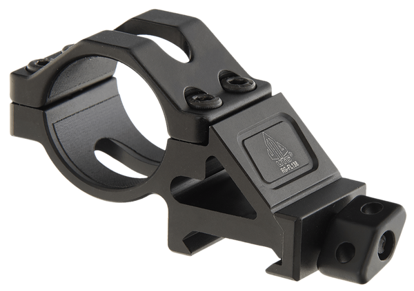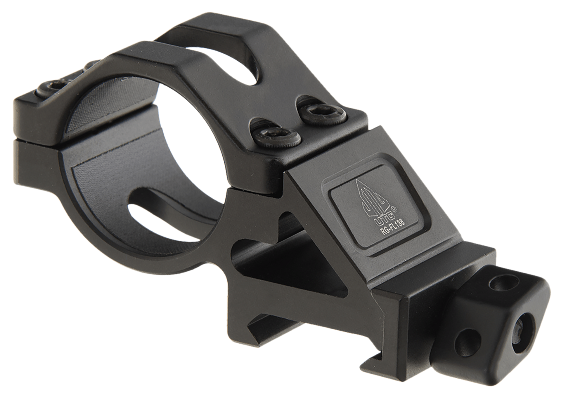 The utg tactical flashlight ring features a 45-degree offset angle for a low-profile, center-bore alignment, supporting modern shooting techniques while clearing most front sight posts when mounted on a top picatinny rail.Made from lightweight, precision-machined aluminum with a black anodized matte finish, it ensures durability and strength.The integral twist-lock mount provides a secure fit on any picatinny/weaver rail, and it includes two spacers to accommodate 27mm, 25.4mm (1"), or 20mm tube light devices for versatile compatibility.