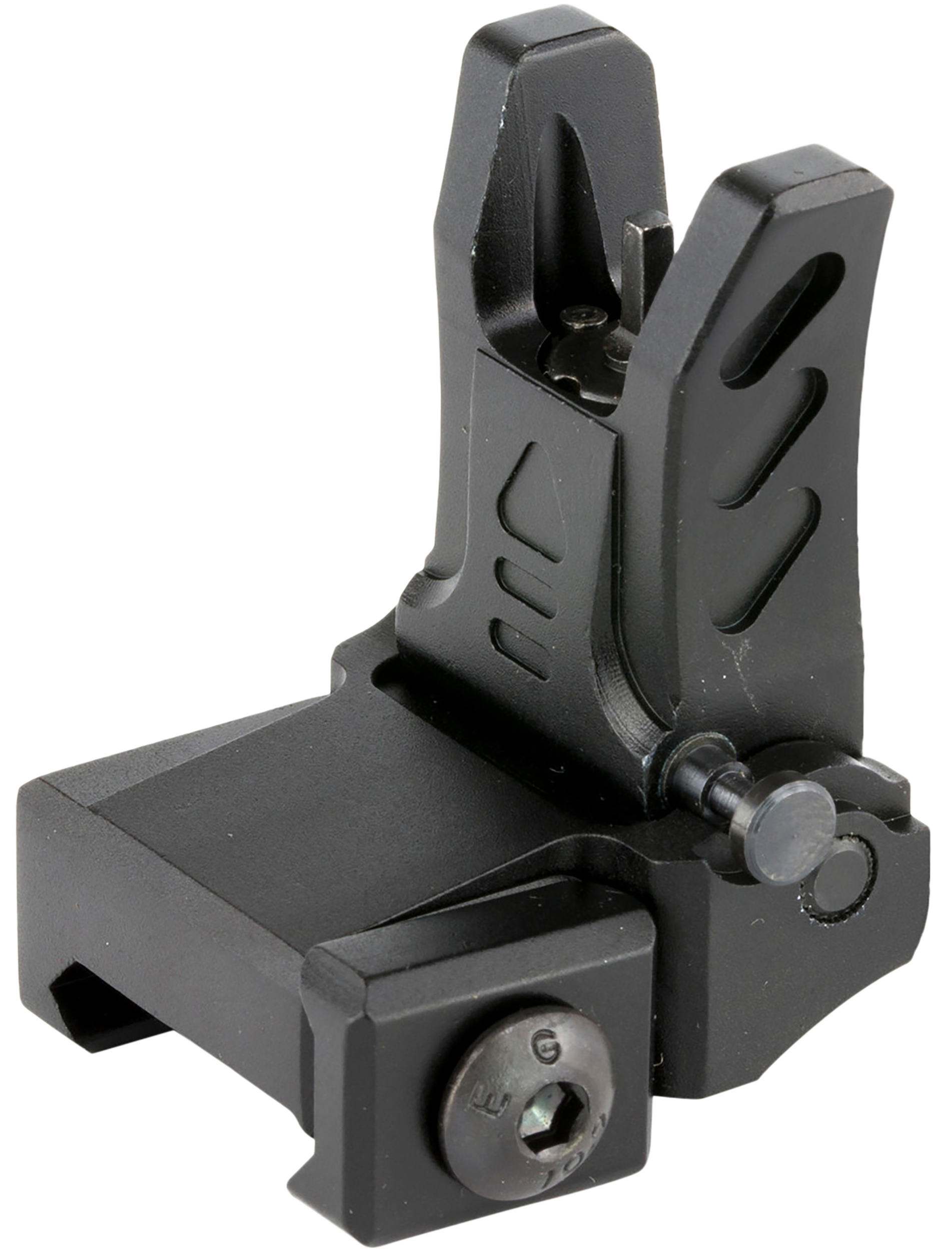 Leapers spring-loaded low profile flip-up front sight for the ar15 is constructed of aluminum with a anodize black finish with a low profile.Spring-loaded posi-lock push button activation automatically deploys sight tower and prevents sight tower from collapsing when deployed.Uses standard a2 front sight post, interchangeable with other aftermarket posts with equivalent dimensions.Utilizes a single locking torx screw with low profile mounting base.Uses 3mm locking bolt and mounting deck, torx locking plate recommended torque value: 35 in-lbs.Requires sight tool.Front sight post width:0.07", post height: 0.26".