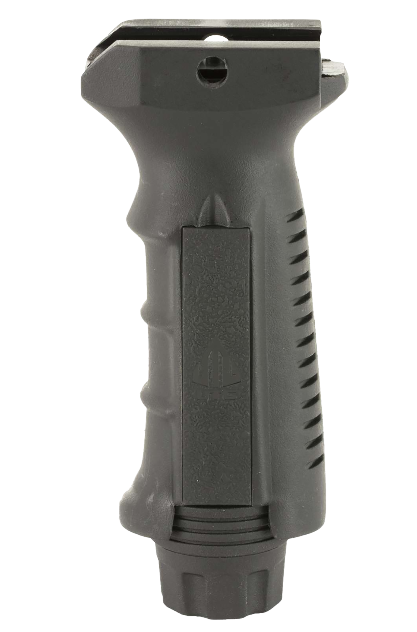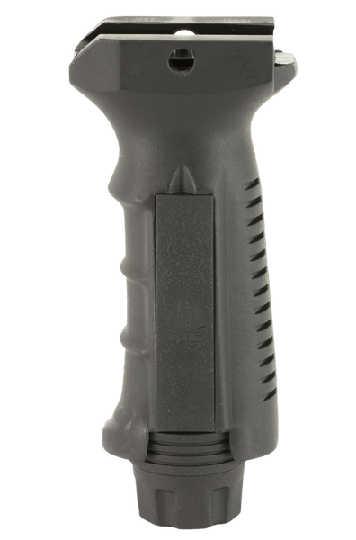 Leapers inc utg vertical foregrip has a picatinny mounting deck, finger grooves, and an end cap for battery storage.