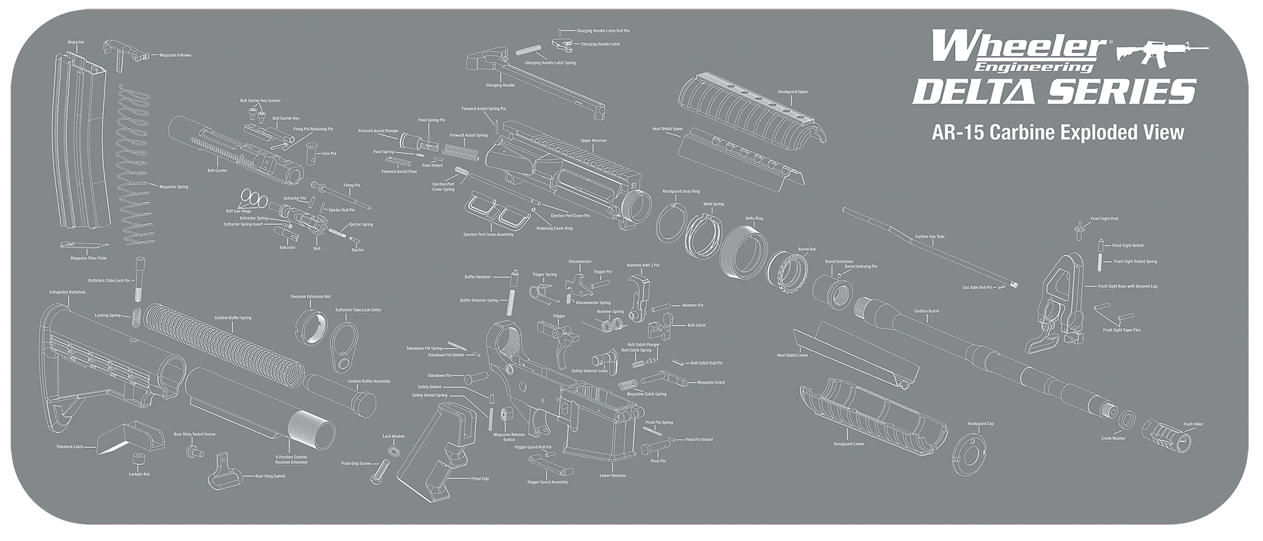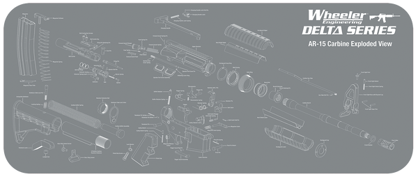 The wheeler delta series ar-15 maintenance mat is perfect for any ar-15 lover, featuring a screen printed exploded view of an ar-15 carbine.It is made of a dark gray no-mar, padded neoprene surface with a durable non-skid rubber backing to protect firearm finishes while helping to keep track of small parts.Excess oils and solvents are absorbed into the mat, keeping the surface clean and dry.Each...View more
