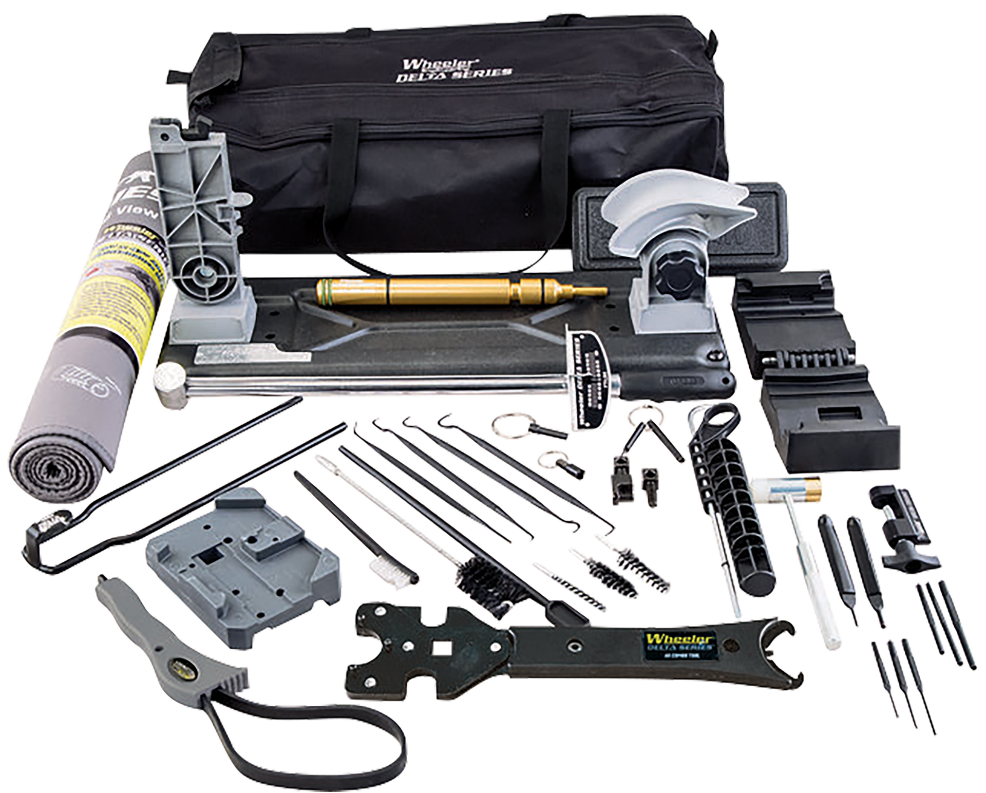 The wheeler delta series ar-15 armorers kit ultra contains every tool a gunsmith or armorer needs to complete a full rifle build, make repairs or perform maintenance on ar-15/m16 platform rifles.This kit can perform over 50 different operations and functions of ar-15 building and maintenance.Delta series tools are designed with specific features to perform functions with precision and ease.Each tool is constructed of the highest quality materials to deliver the best performance at a great value.The wheeler delta series ar-15 armorers kit ultra includes- ar armorers vise, ar-15 combo tool, torque wrench,ar-15 armorers bench block, ar-15 roll pin install tool kit, upper vise block clamp with gas tube alignment tool, maintenance mat with exploded view ar-15, pivot pin & roll pin installation tool, ar front sight tool, delta ring tool, strap wrench, ar-15 bore guide, ar-15 adjustable receiver link, bore brush,.22 cal., bolt carrier brush, chamber brush, magazine/upper receiver brush, nylon brush handle, double-ended general cleaning brush, cleaning pick set and custom fitted carrying case.