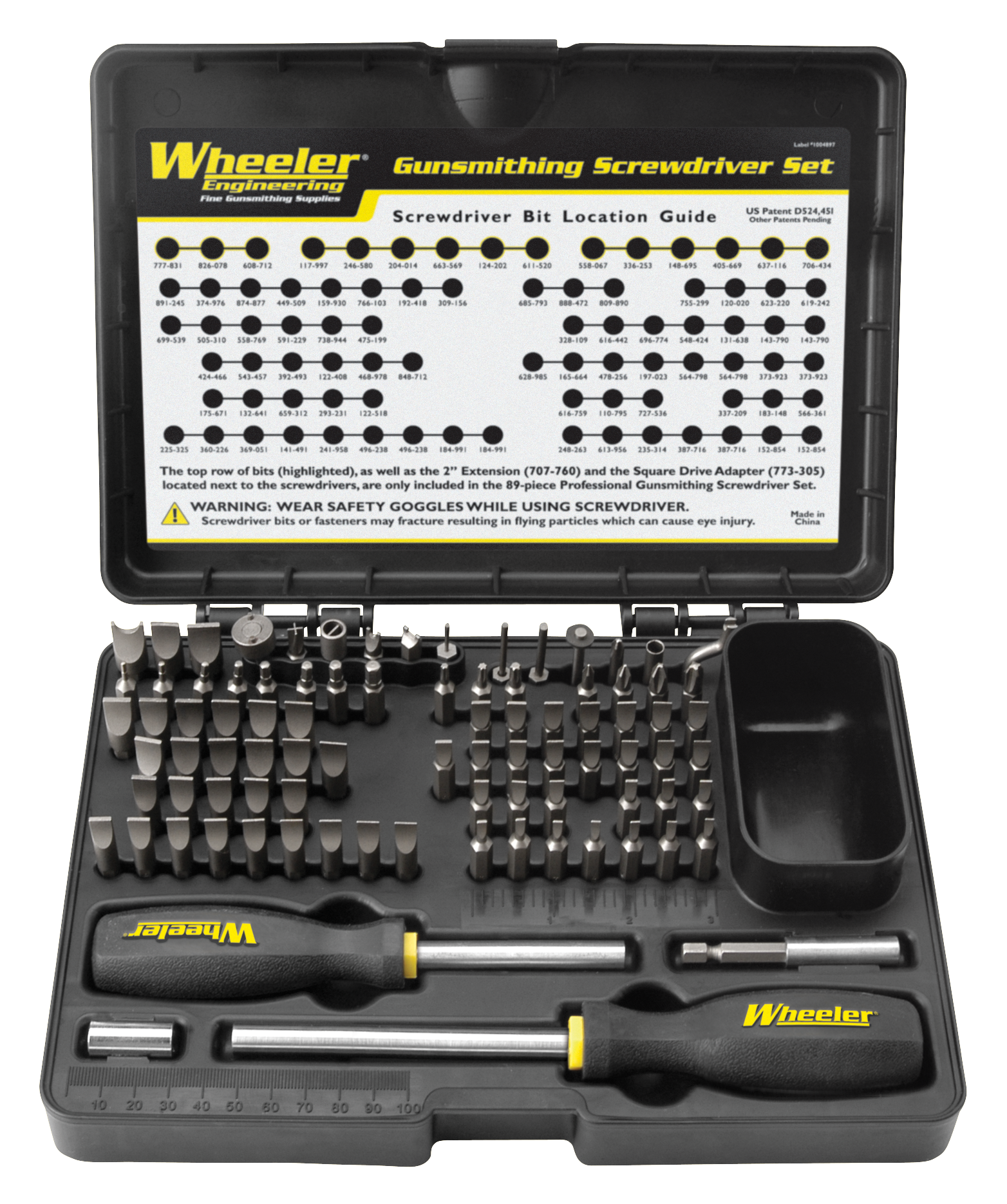 Wheeler's deluxe gunsmithing screwdriver set belongs on every gunsmithing bench.The bits are made from s2 tool steel and hardened to 56-58 rockwell "c".The 54 hollow-ground flat bits range in size from.120"x.020" to.360"x.070" and includes doubles in the thinnest sizes.This set includes two each of the very thinnest bits, a complete selection of phillips, allen and torx bits to cover scope rings, bases, recoil pads.The 15...View more