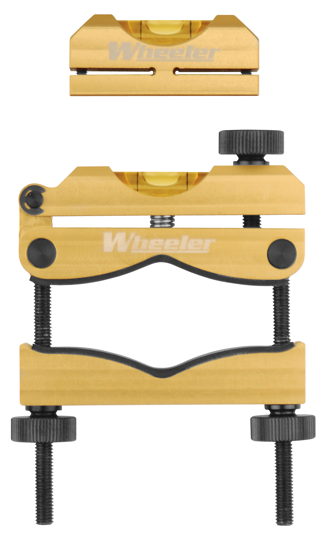 The system is comprised of two machined aluminum level housings calibrated to their integrated levels.It is attached to the guns barrel while the smaller reference level is placed on scope base, bottom half of a ring or other flat surface perpendicular to the vertical axis of the gun.The gun is then rotated until the reference level is aligned.Its tuning adjustment knob on the barrel clamp level is then turned until its level is centered to match the reference level.At this point the barrel clamp level is calibrated to the guns axis.The scope can be installed loosely and the reference level placed on top of the scopes turret cap.The scope is rotated until the reference level is aligned with the barrel clamp level and then simply secured in place.