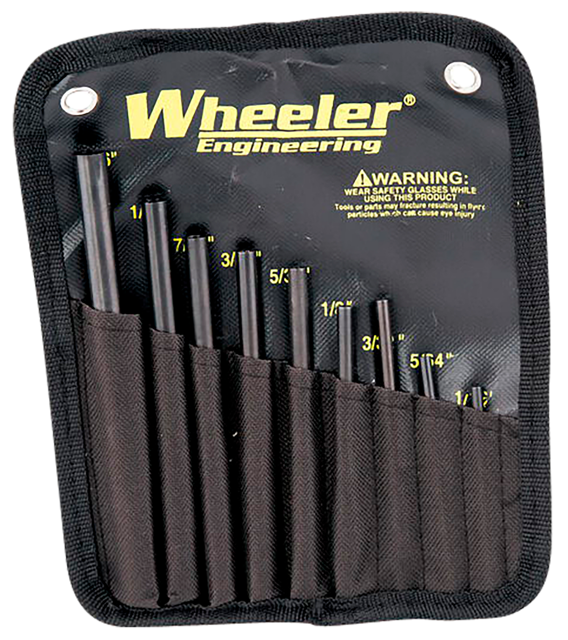 The wheeler engineering roll pin punches are machined from hardened steel to prevent bending or breaking while driving any size roll pin.The punches are designed with a hemispherical tip to provide proper alignment of the roll pin to prevent damage to the roll pin and firearm.The 9 piece set includes: 5/16, 1/4, 7/32, 3/16, 5/32, 1/8, 3/32, 5/64,and 1/16 punches in a durable nylon sheath.Handle...View more