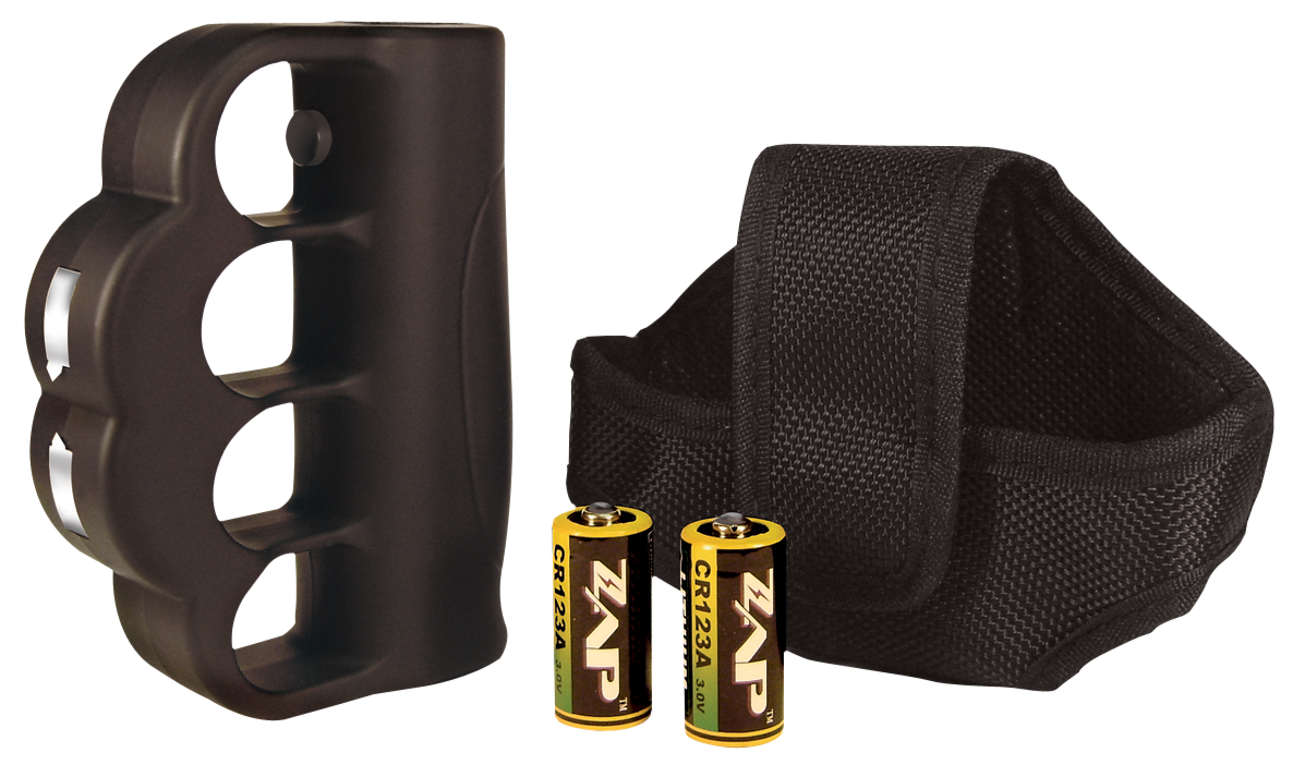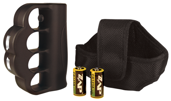 Zap's blast knuckle stun gun is a uniquely designed stun device to take advantage of the way we use our hands.You only need to touch your target with these knuckles to deliver a 950,000-volt blow that will cause further disorientation and may drop them to their knees.It is rubber-coated with a soft contour grip for full control and has a red led on/off indicator.It includes a heavy nylon case with a belt clip and 2 cr123a batteries.